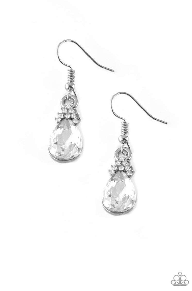 Crowned in glassy white rhinestones, a dazzling white teardrop gem swings from the ear for a glamorous look. Earring attaches to a standard fishhook fitting.