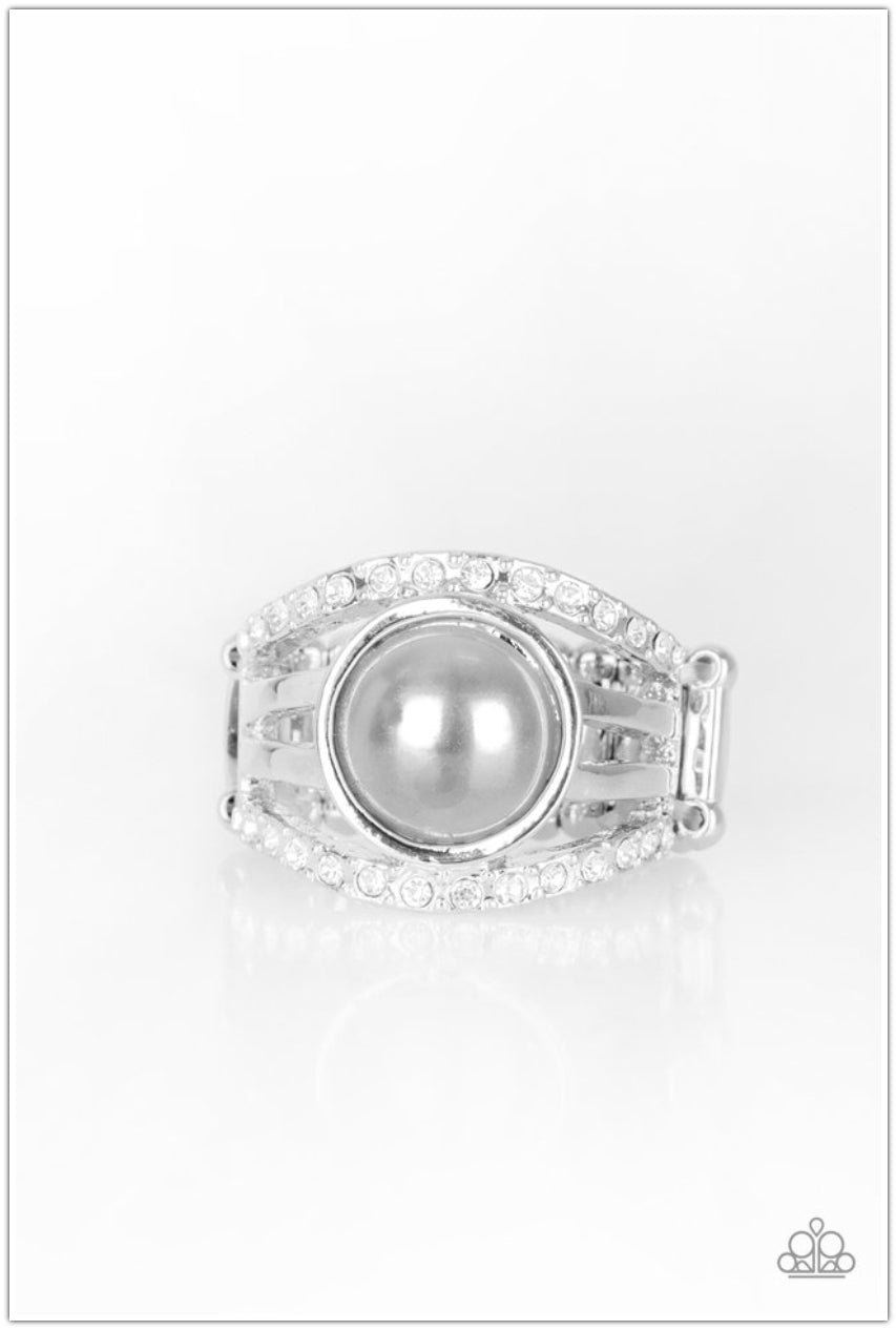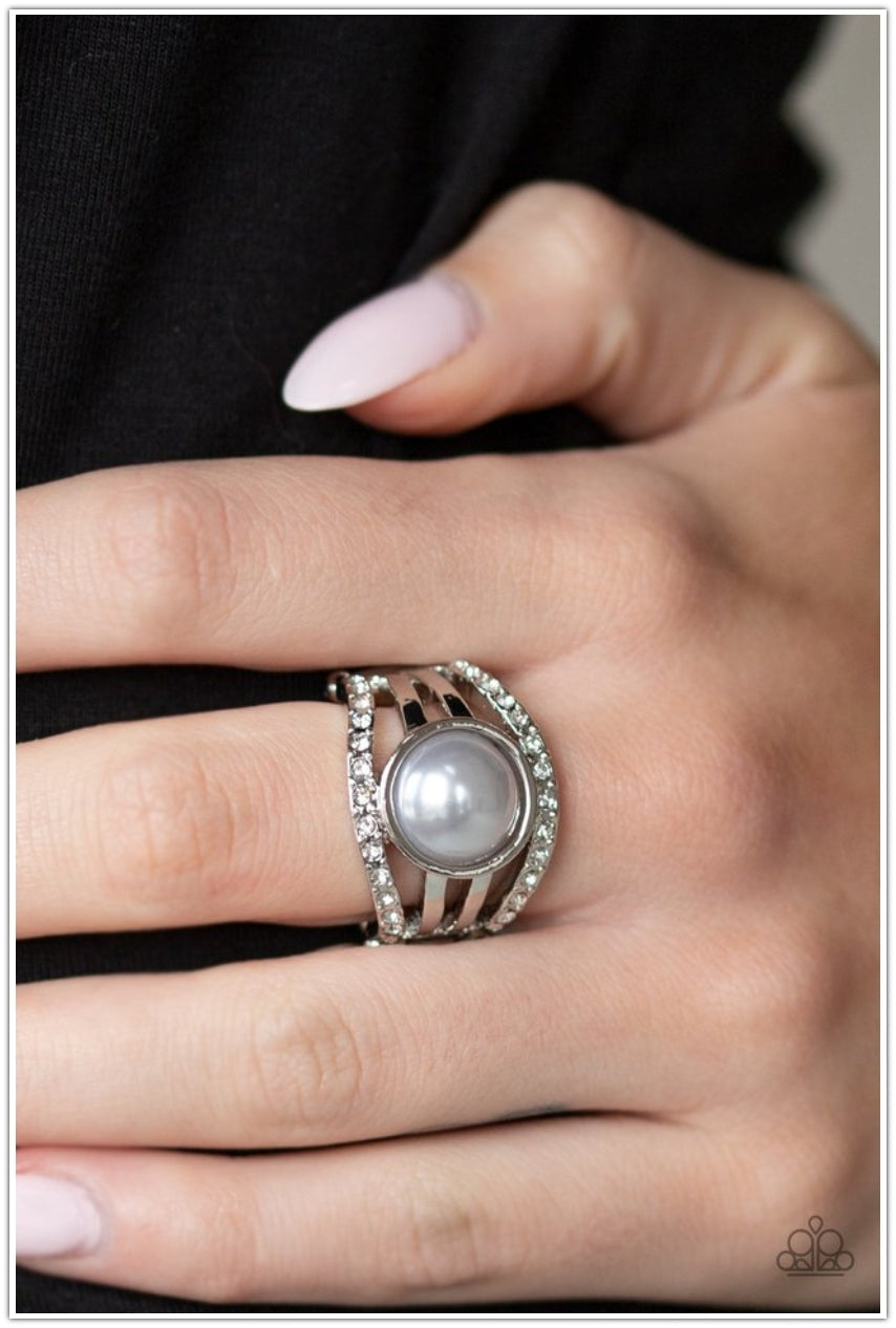 Radiating with glassy white rhinestones, row after row of glittering silver bars arc across the finger. A pearly silver bead is pressed into the center of the layered bands, adding a dramatically refined finish to the piece. Features a stretchy band for a flexible fit.
