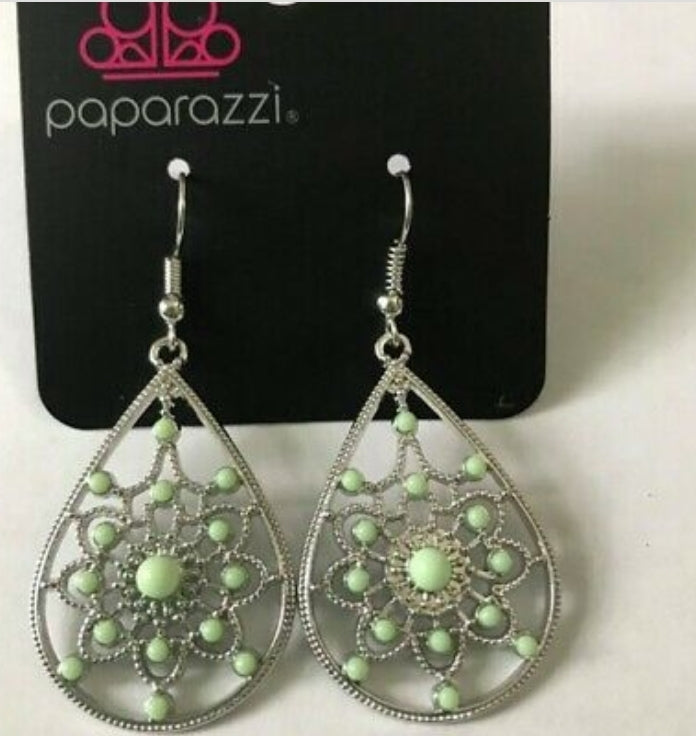 Featuring an elegant filigree filled backdrop, a shimmery silver teardrop swings from the ear. Dainty green beads are sprinkled across the frame for a floral finish. Earring attaches to a standard fishhook fitting.