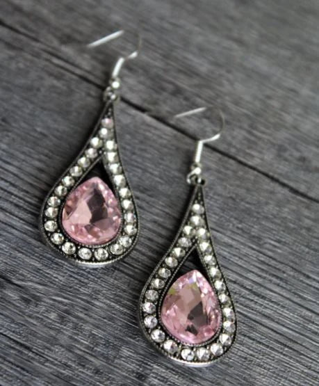 An oversized pink teardrop gem is nestled inside the bottom of a ribbon of glittery white rhinestones, creating a dramatic lure. Earring attaches to a standard fishhook fitting.