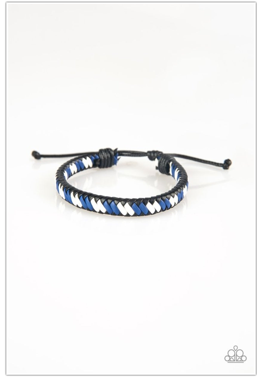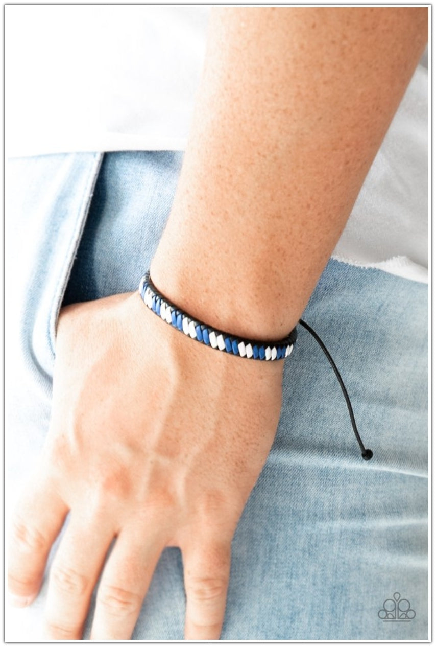 Black, blue, and white leather cording weaves around the wrist, creating a colorful braid. Features an adjustable sliding knot closure.