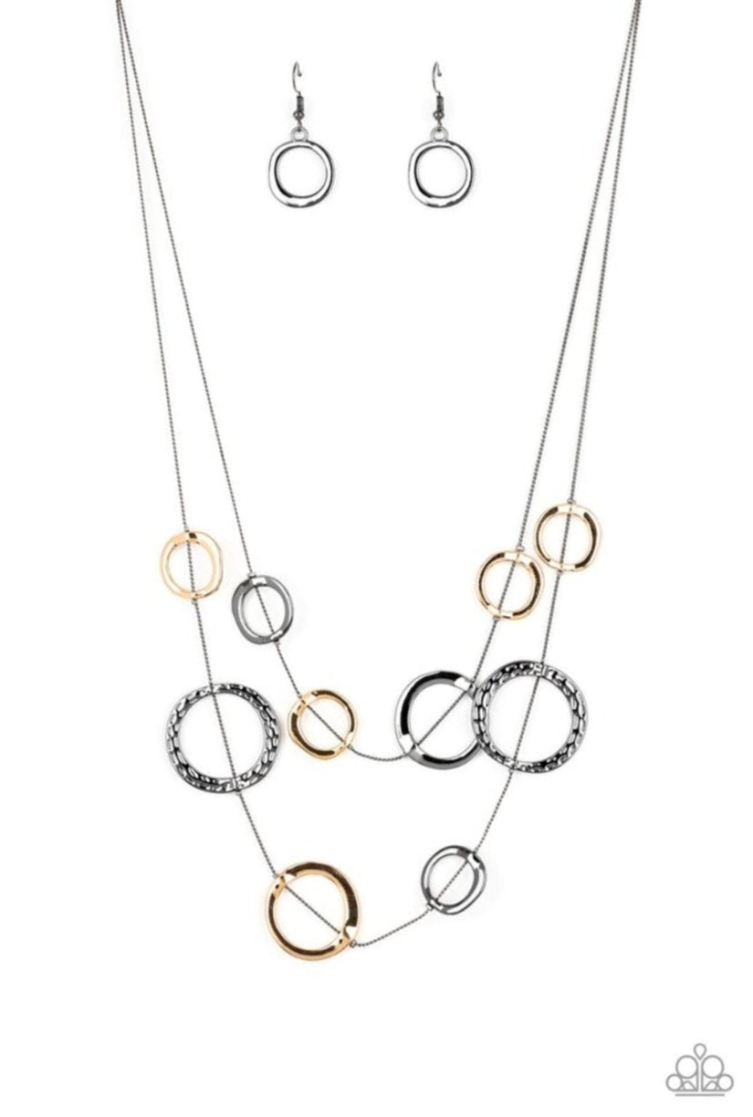 Featuring smooth and hammered finishes, a collection of asymmetrical gunmetal and gold rings are fitted in place along wire-like chains below the collar for a classically layered look. Features an adjustable clasp closure.