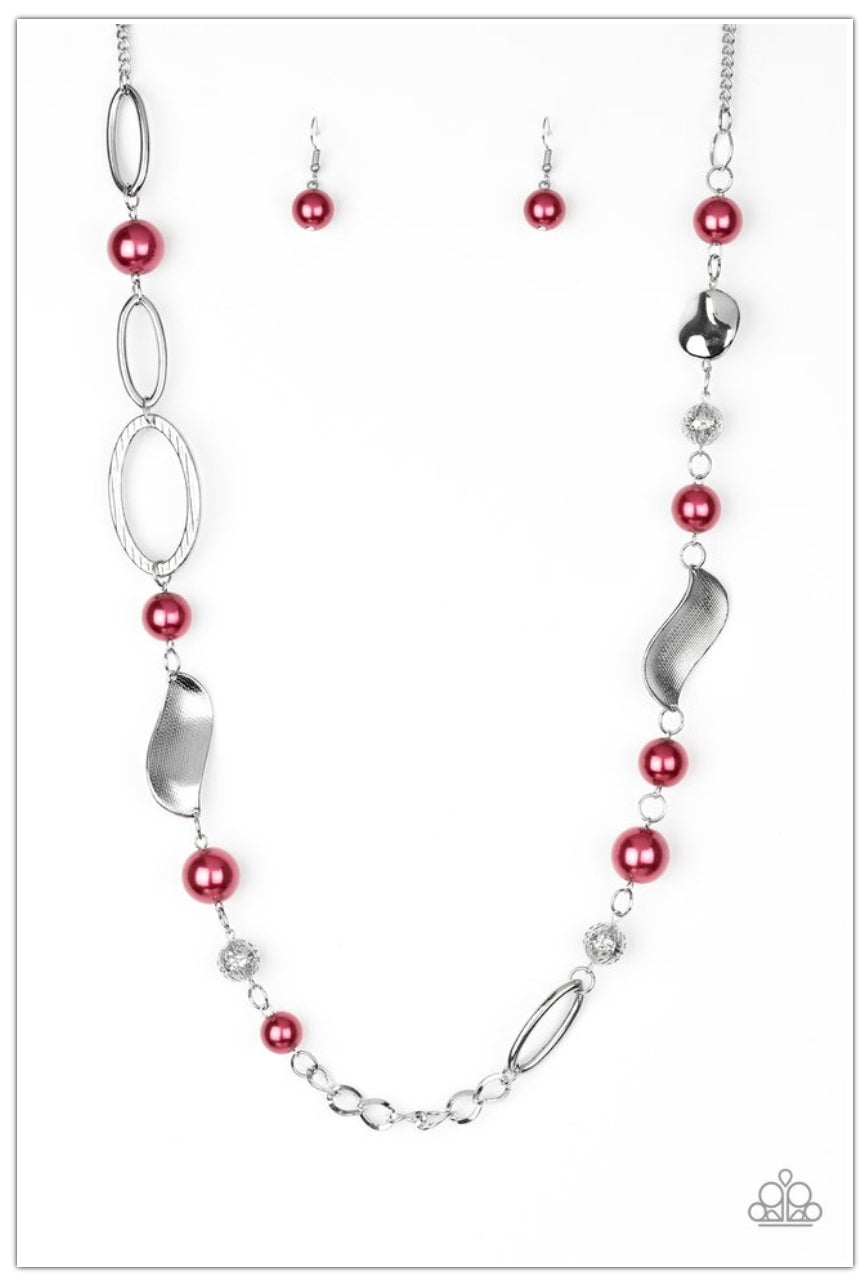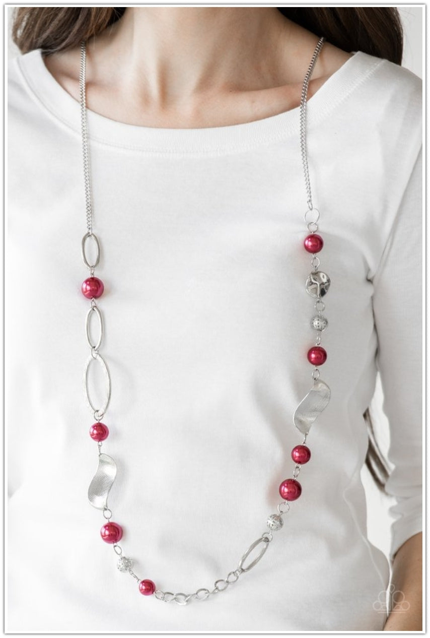 Oversized red pearls, ornate silver beads, and an array of glistening silver accents trickle along a lengthened silver chain for a refined look. Features an adjustable clasp closure.