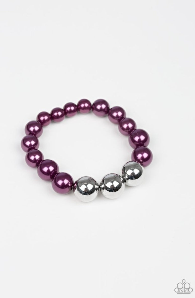 Gradually increased in size near the center, oversized pearly purple and shiny silver beads are threaded along a stretchy band around the wrist for a glamorous finish.