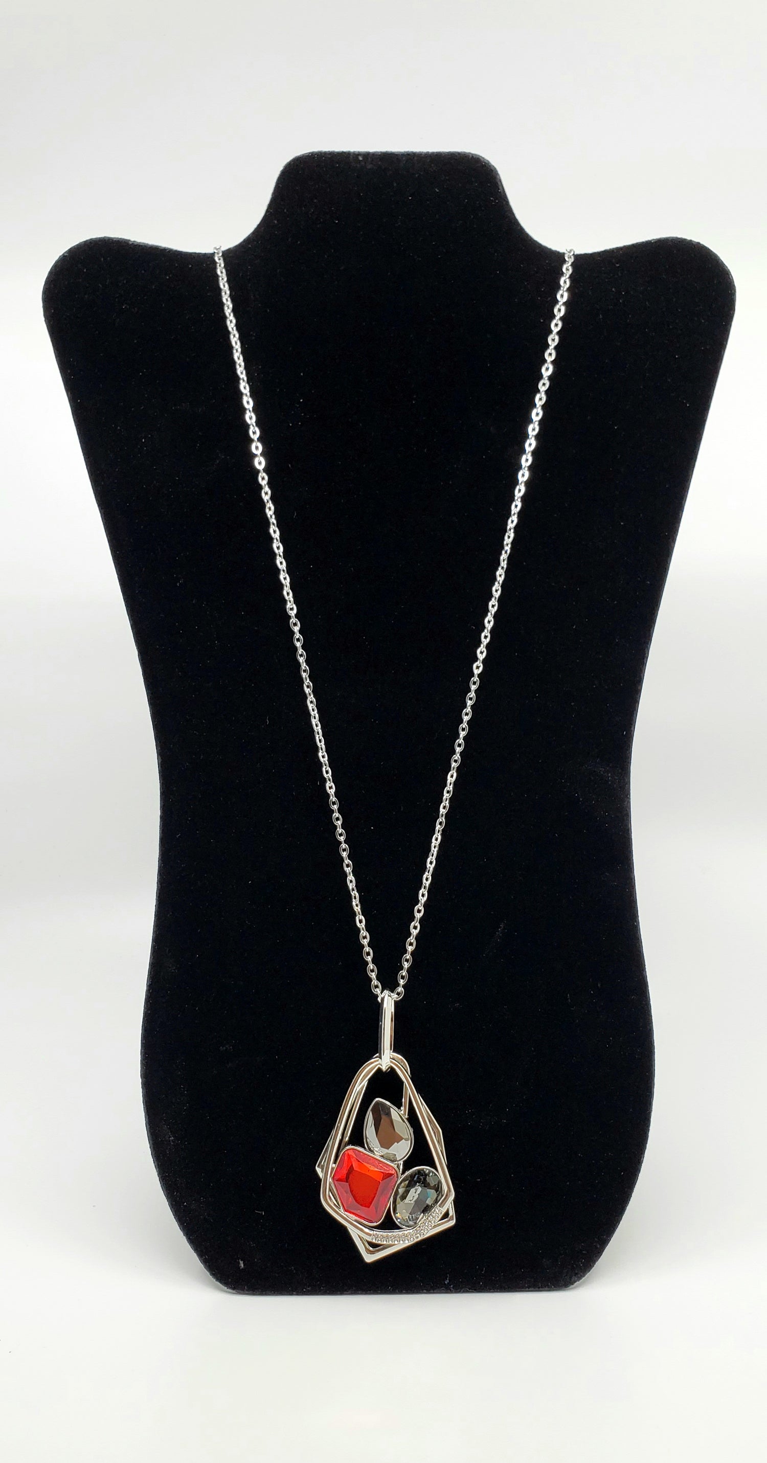 Varying in shape, mismatched geometric silver frames swing from the bottom of a lengthened silver chain. An oval smoky rhinestone, teardrop hematite rhinestone, and red gem sporadically embellish each frame while the largest frame is dusted in glassy white rhinestones for an elegant asymmetrical finish. Features an adjustable clasp closure.