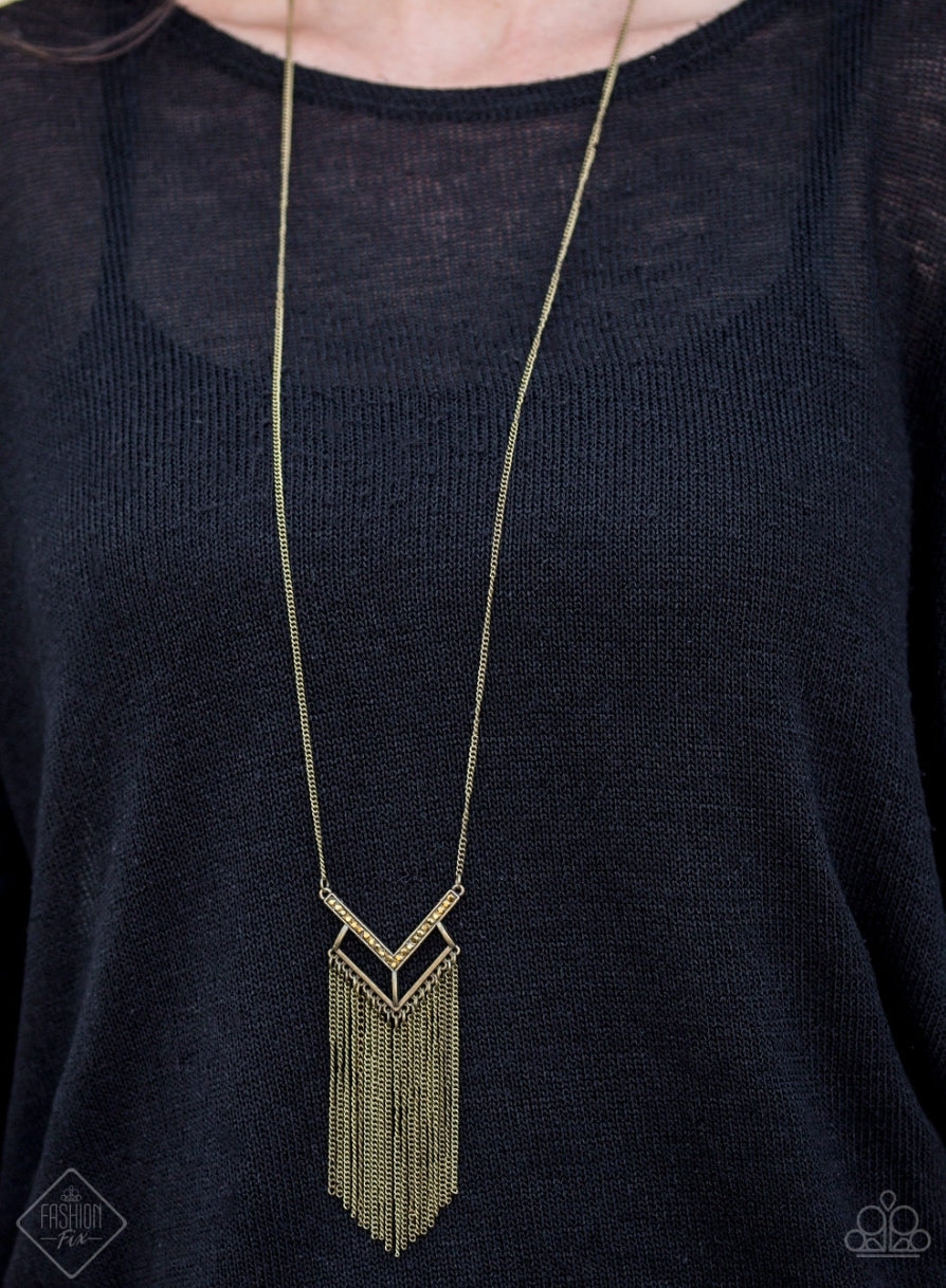 Encrusted in aurum rhinestones, a V-shaped frame attaches to an airy brass frame, creating a stacked pendant. Swinging from the bottom of a lengthened brass chain, the glamorous pendant gives way to a tapered fringe for a fierce finish. Features an adjustable clasp closure.