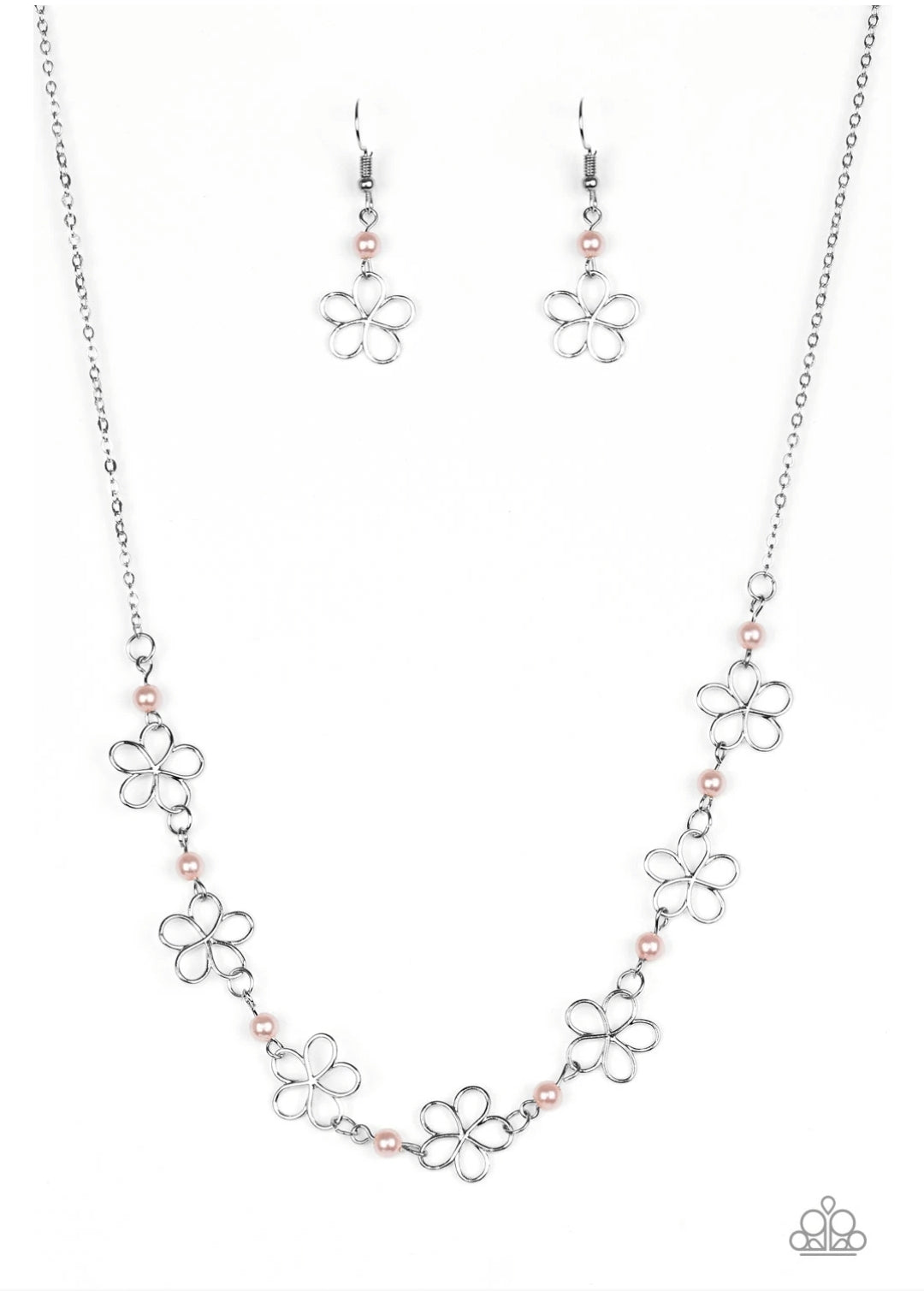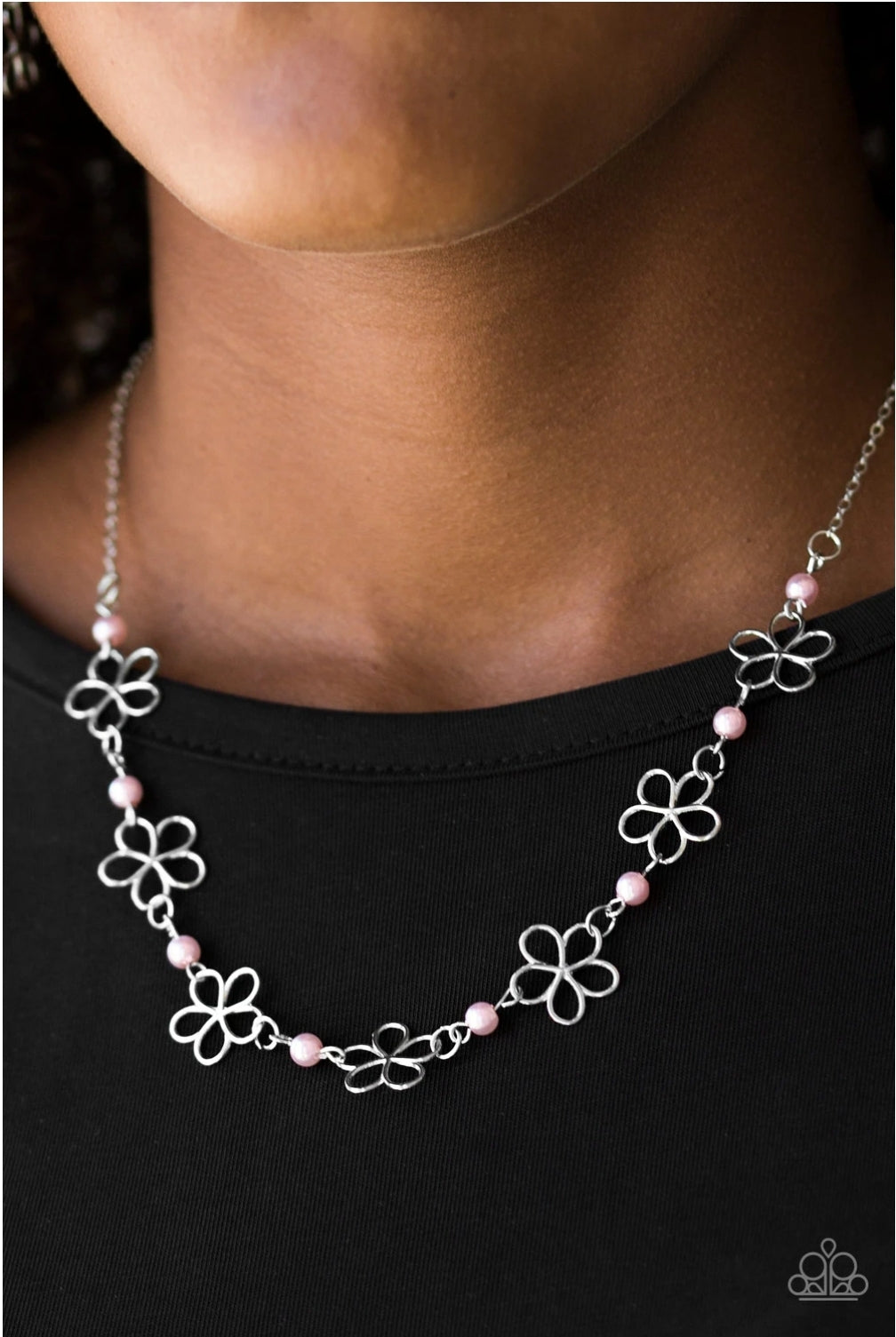 Dainty pink pearls and airy floral frames link below the collar for a seasonal look. Features an adjustable clasp closure.