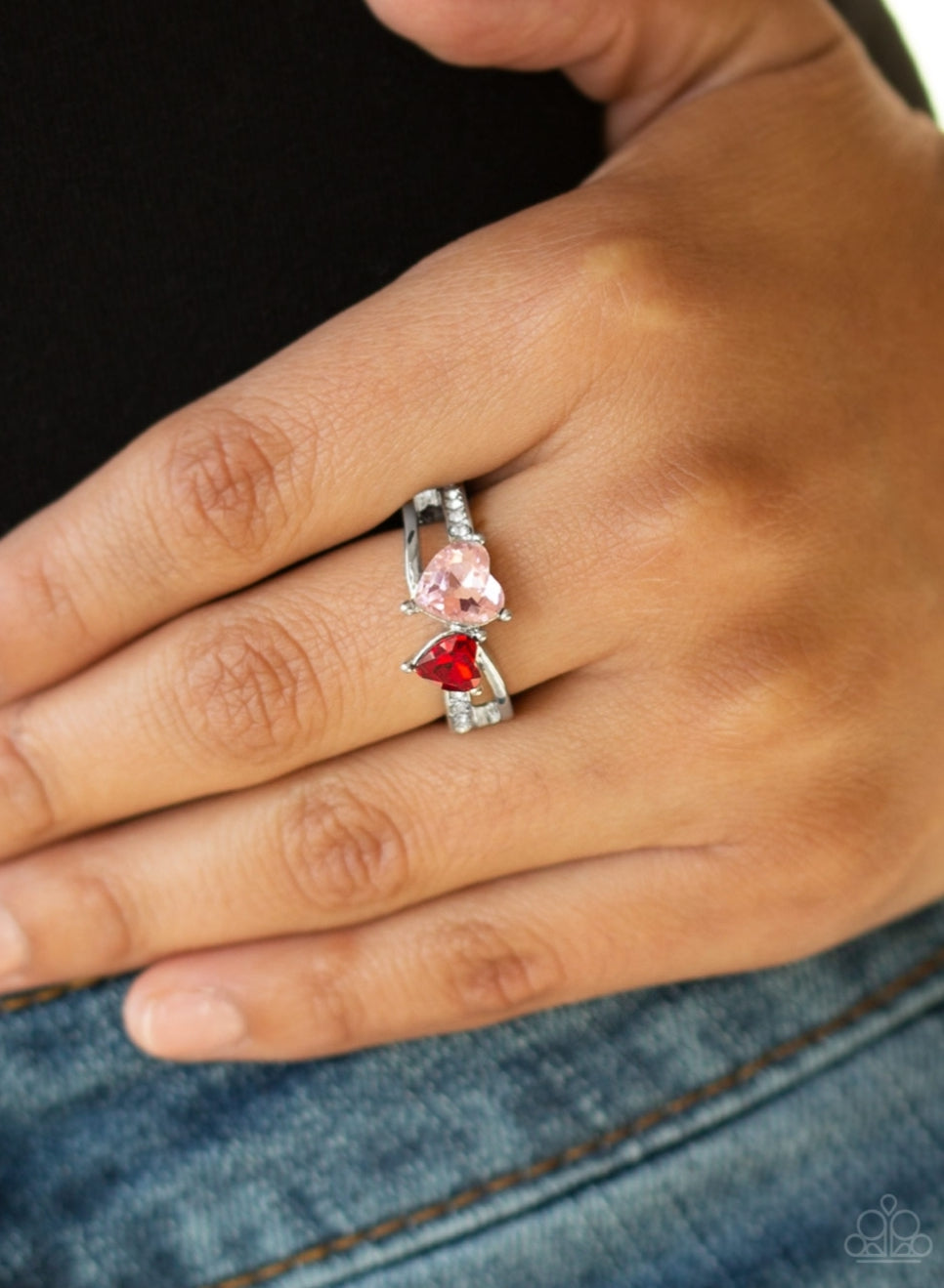 Infused with dainty white rhinestone encrusted silver bands, pink and red heart-shape rhinestones delicately come together at the center of the finger. Features a dainty stretchy band for a flexible fit.