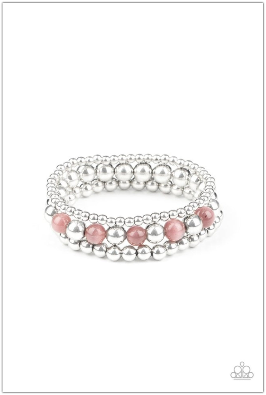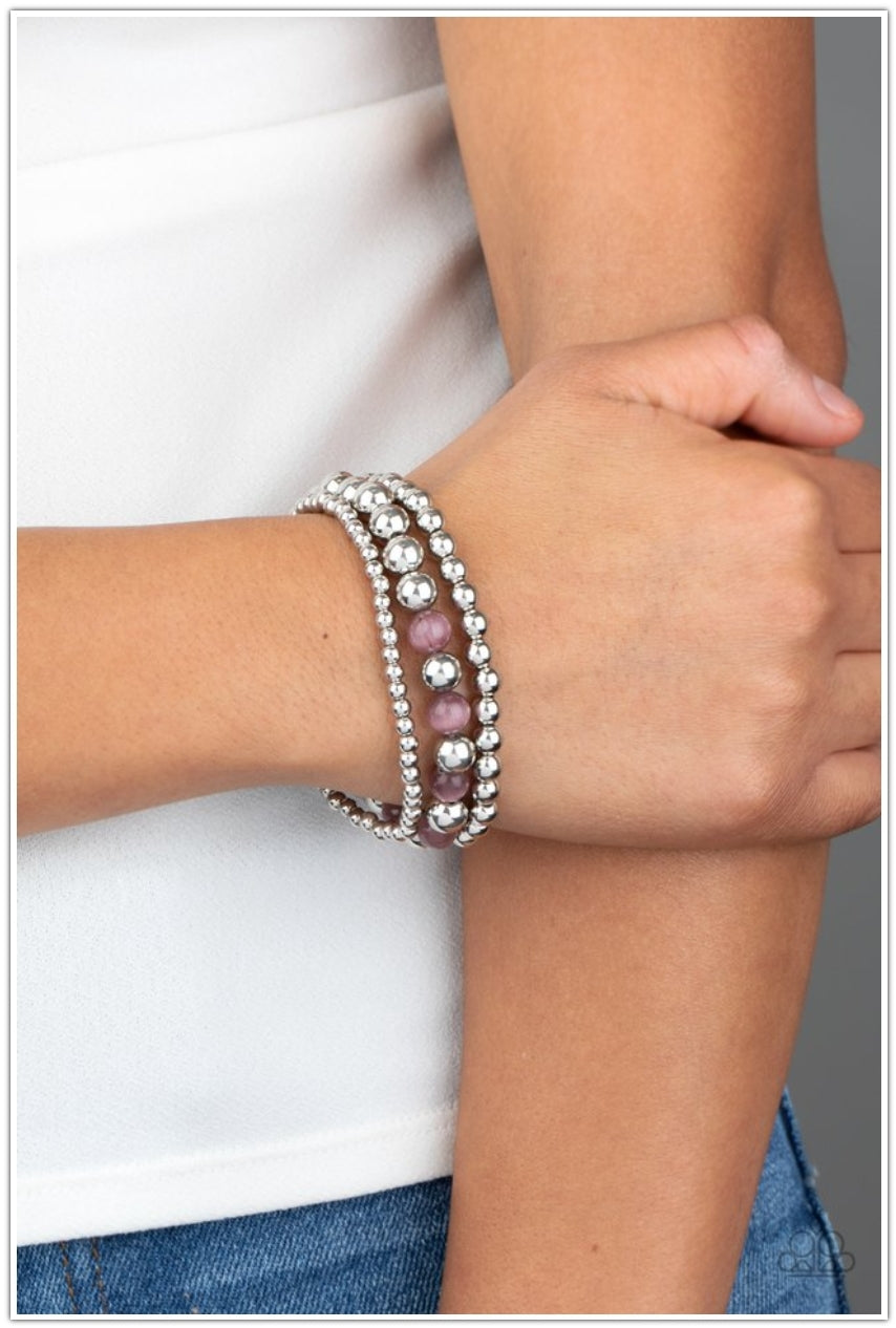 Infused with glowing purple moonstones, shiny silver beads are threaded along stretchy bands for a whimsical look.