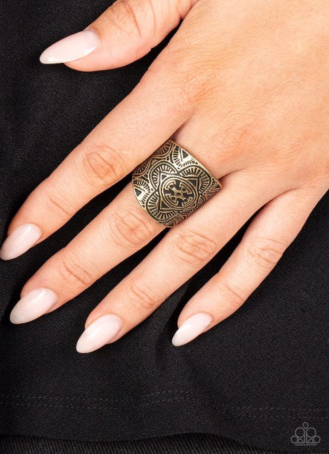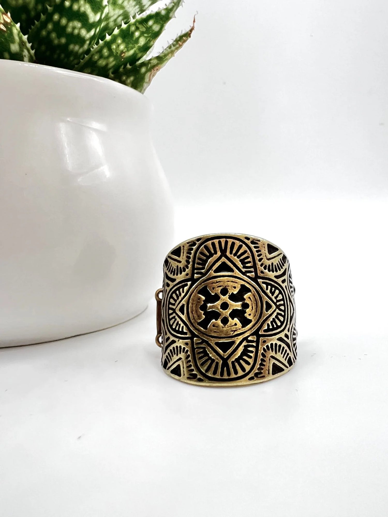 Engraved geometric shapes, lines, and patterns fill a brass plate that curves around the finger, creating a trendy centerpiece. Features a stretchy band for a flexible fit.