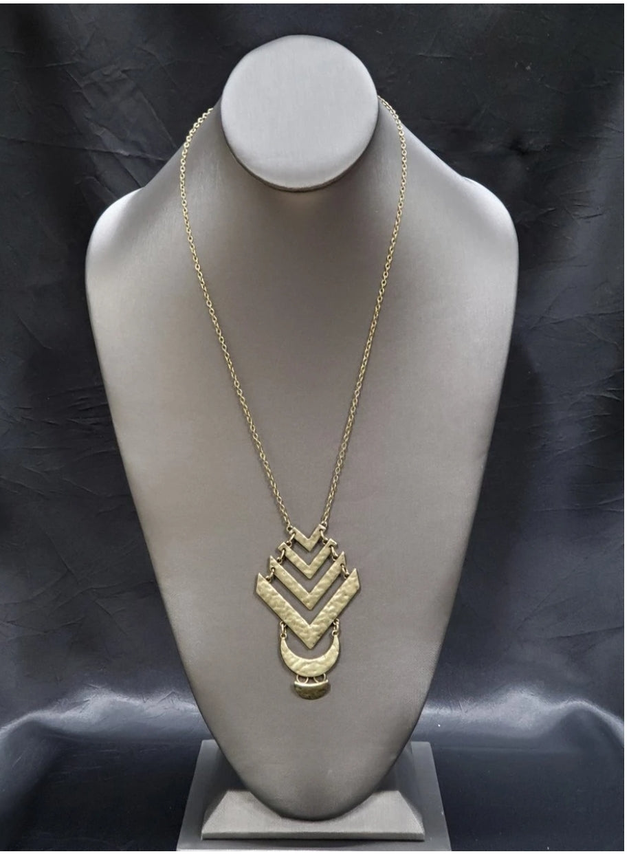 Featuring an antiqued finish, hammered chevron-like and crescent shaped frames link at the bottom of a lengthened brass chain, creating a stacked tribal inspired pendant. Features an adjustable clasp closure.