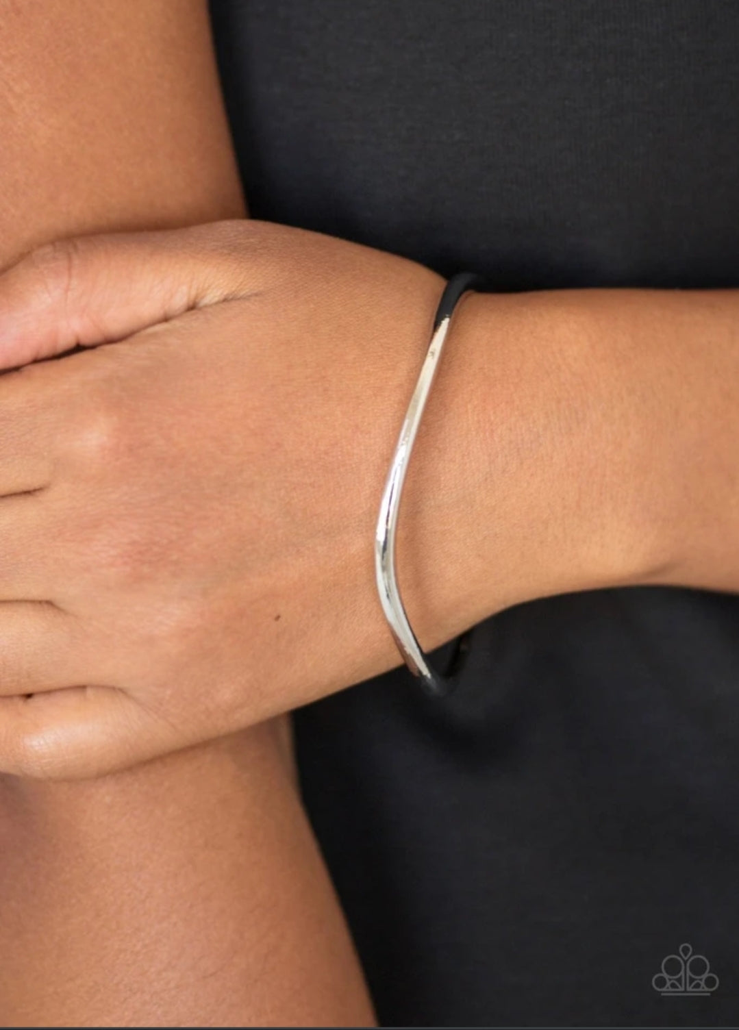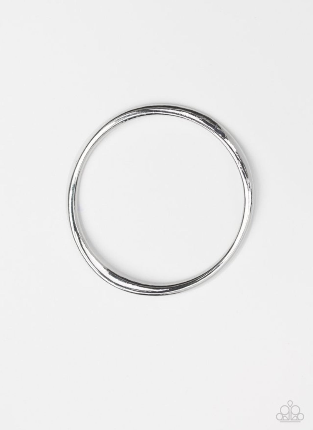Featuring a warped surface, an asymmetrical shiny silver bangle slides along the wrist for an edgy look.