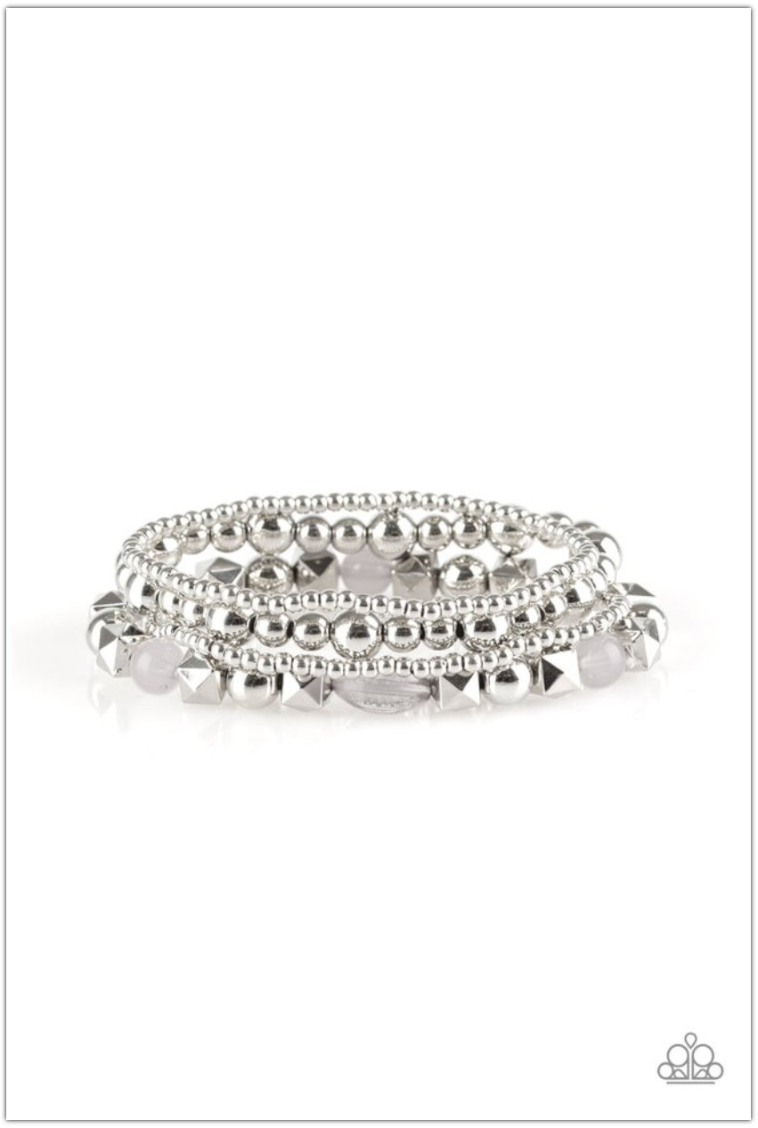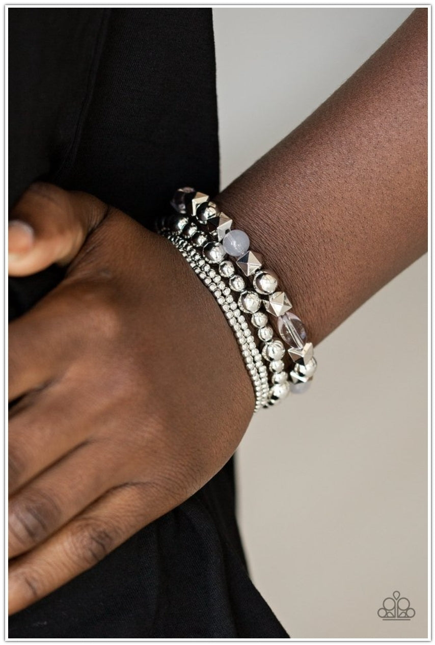 Mismatched silver beads and glassy silver beads are threaded along stretchy bands, creating colorful layers across the wrist.