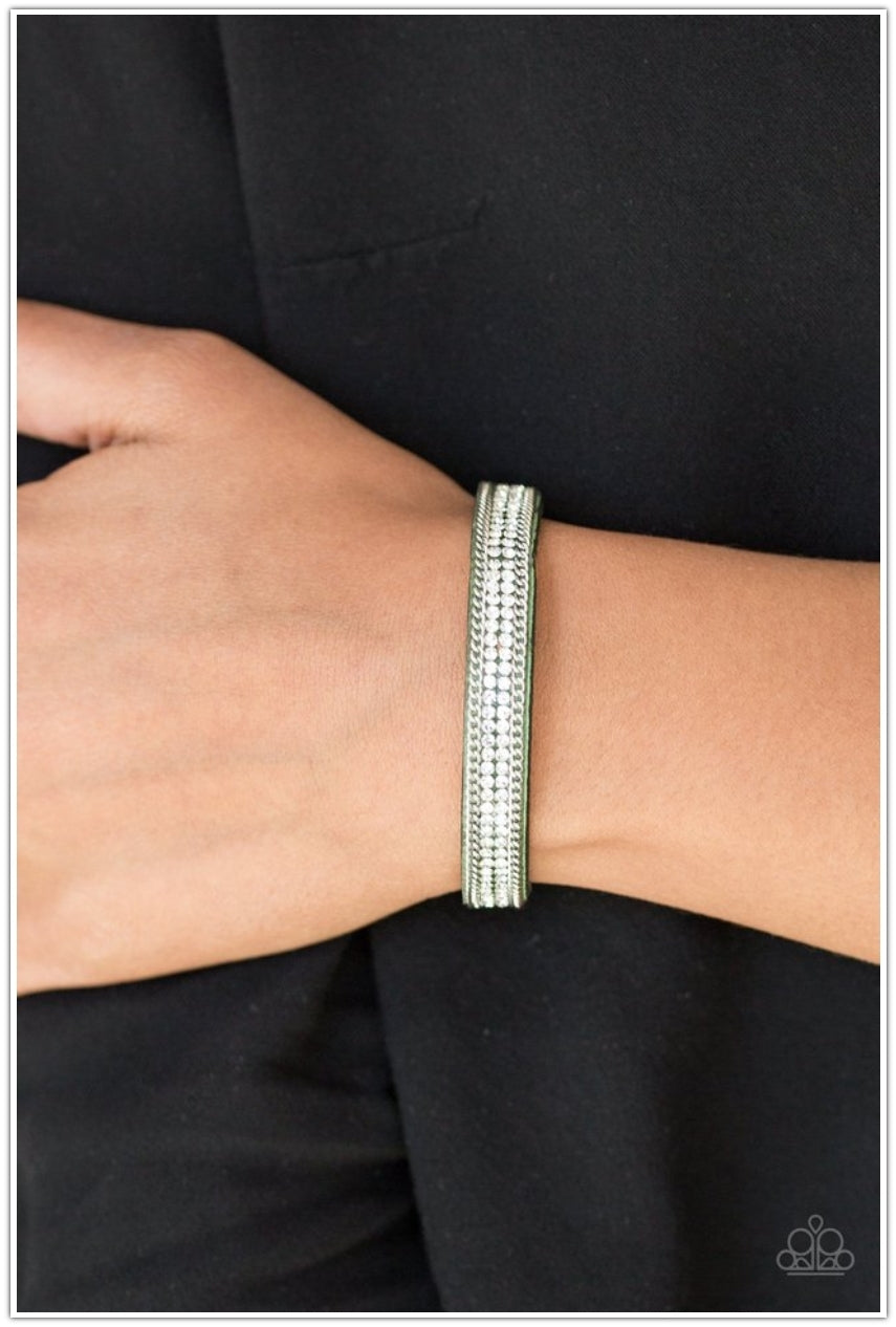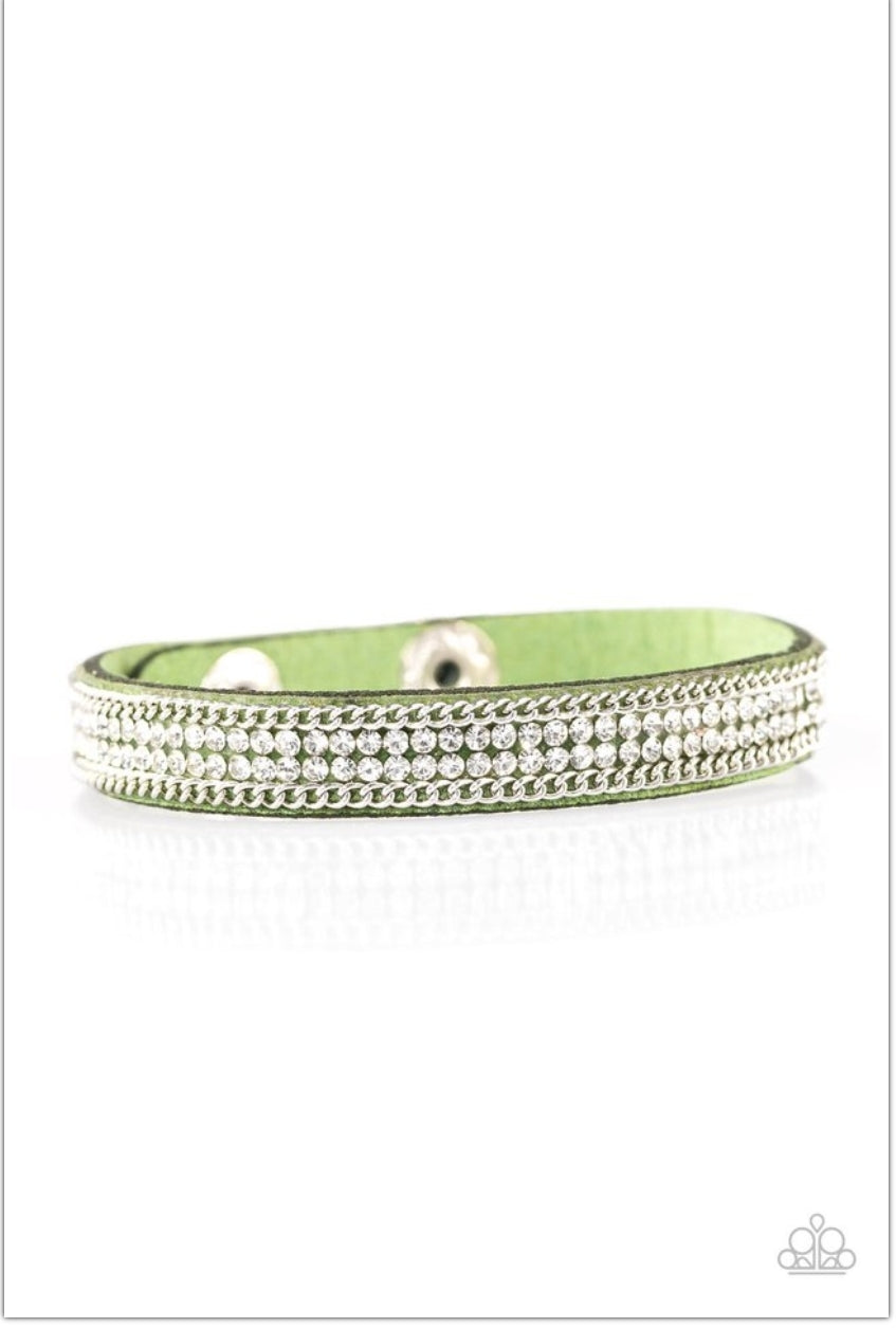 A skinny strand of green suede is encrusted in rows of glittery white rhinestones and shimmery silver chains for a sassy look. Features an adjustable clasp closure.