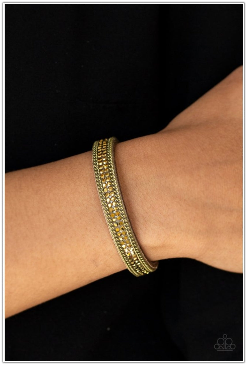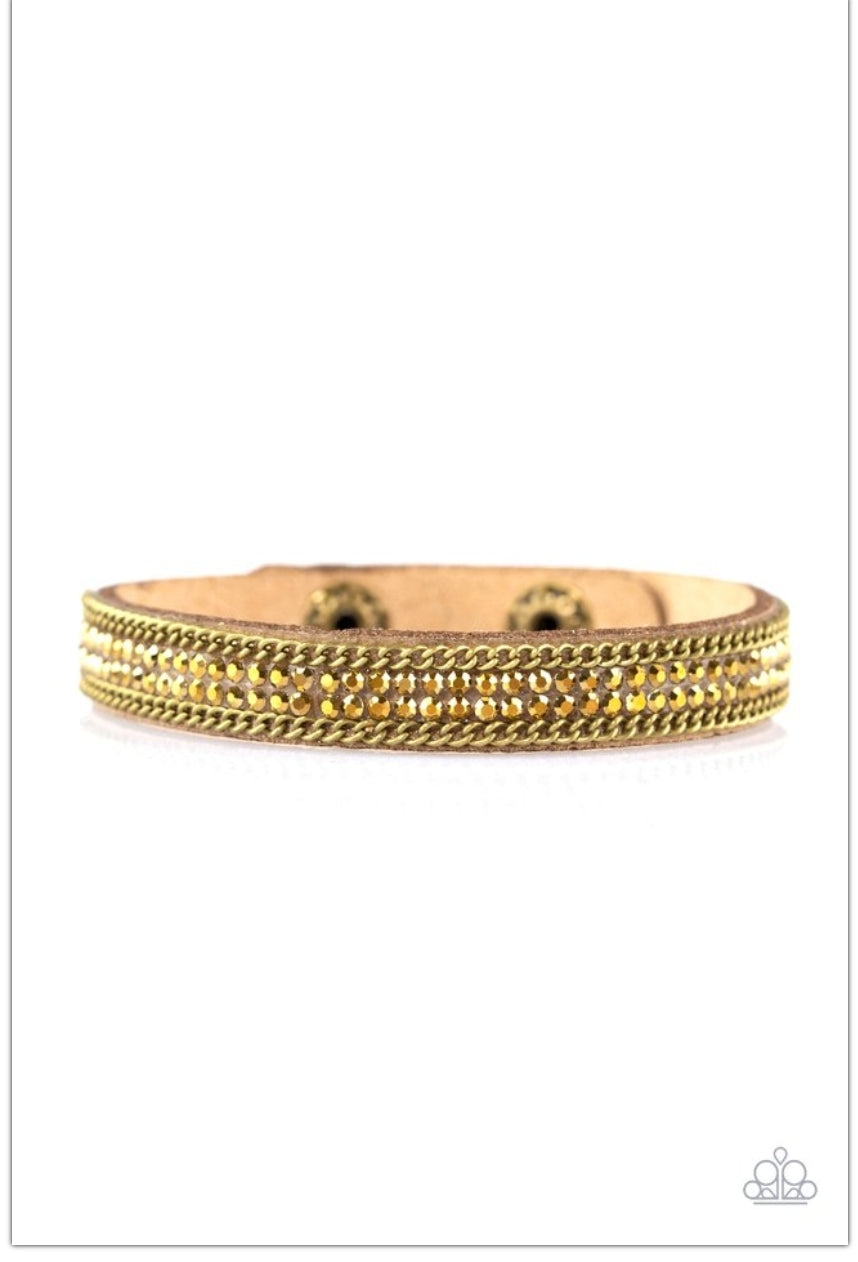A skinny strand of brown suede is encrusted in rows of glittery aurum rhinestones and shimmery brass chains for a sassy look. Features an adjustable clasp closure.