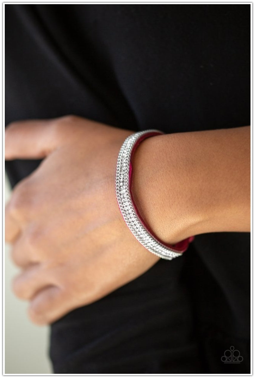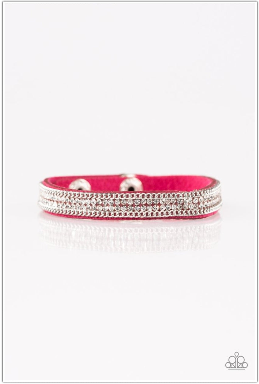 A skinny strand of pink suede is encrusted in rows of glittery white rhinestones and shimmery silver chains for a sassy look. Features an adjustable clasp closure.