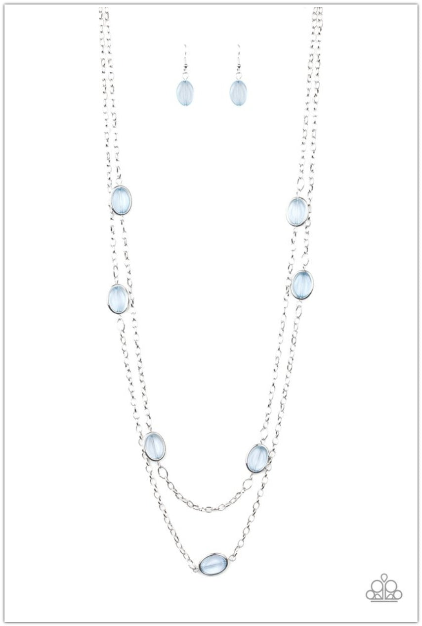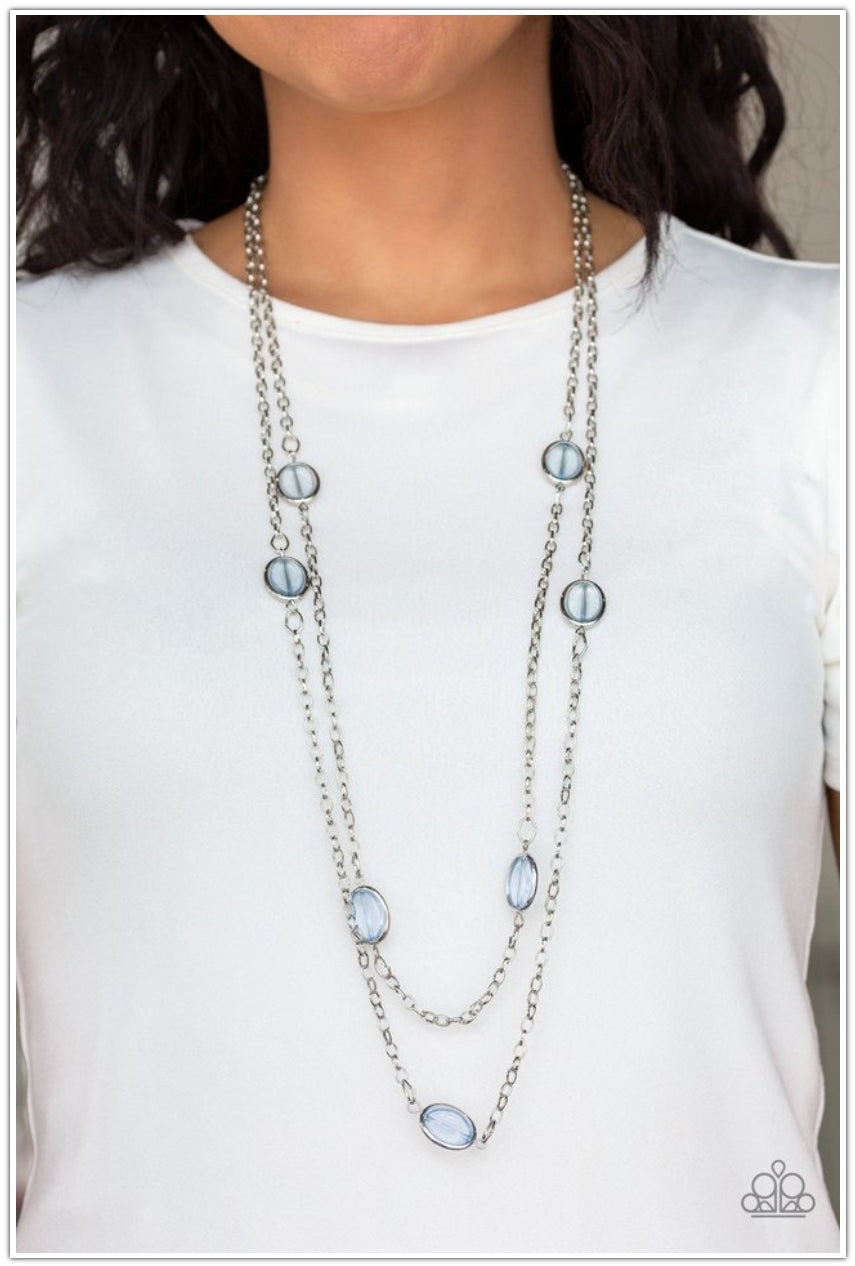 Glassy blue beads are threaded along metallic rods, allowing them to spin inside their silver fittings. The colorful frames trickle along two shimmery chains across the chest for a refined layered look. Features an adjustable clasp closure.