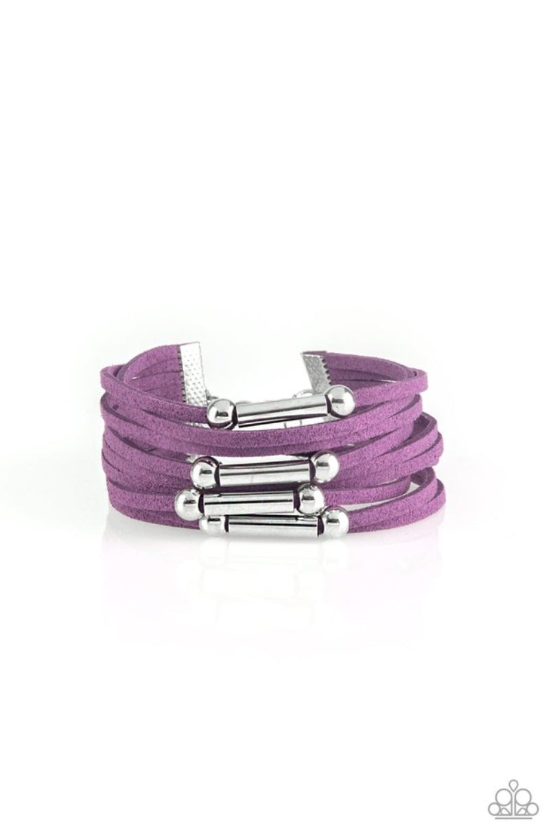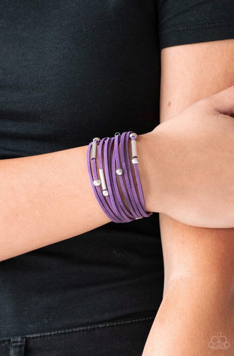 Strung between two silver fittings, glistening silver and gunmetal accents slide along strands of purple suede for a seasonal look. Features an adjustable clasp closure.