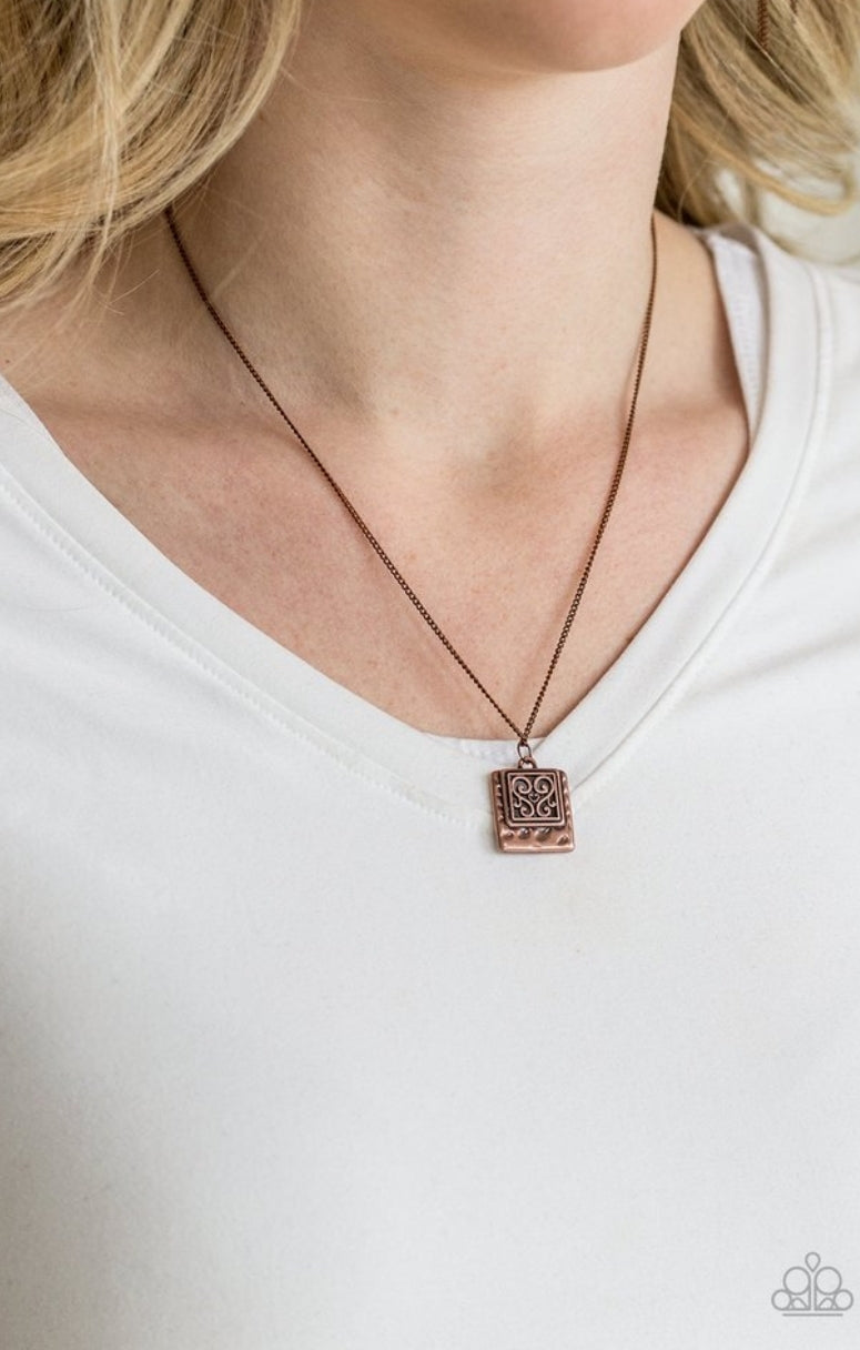 A filigree filled copper frame is pressed into a larger hammered frame, creating a dainty pendant below the collar. Features an adjustable clasp closure.