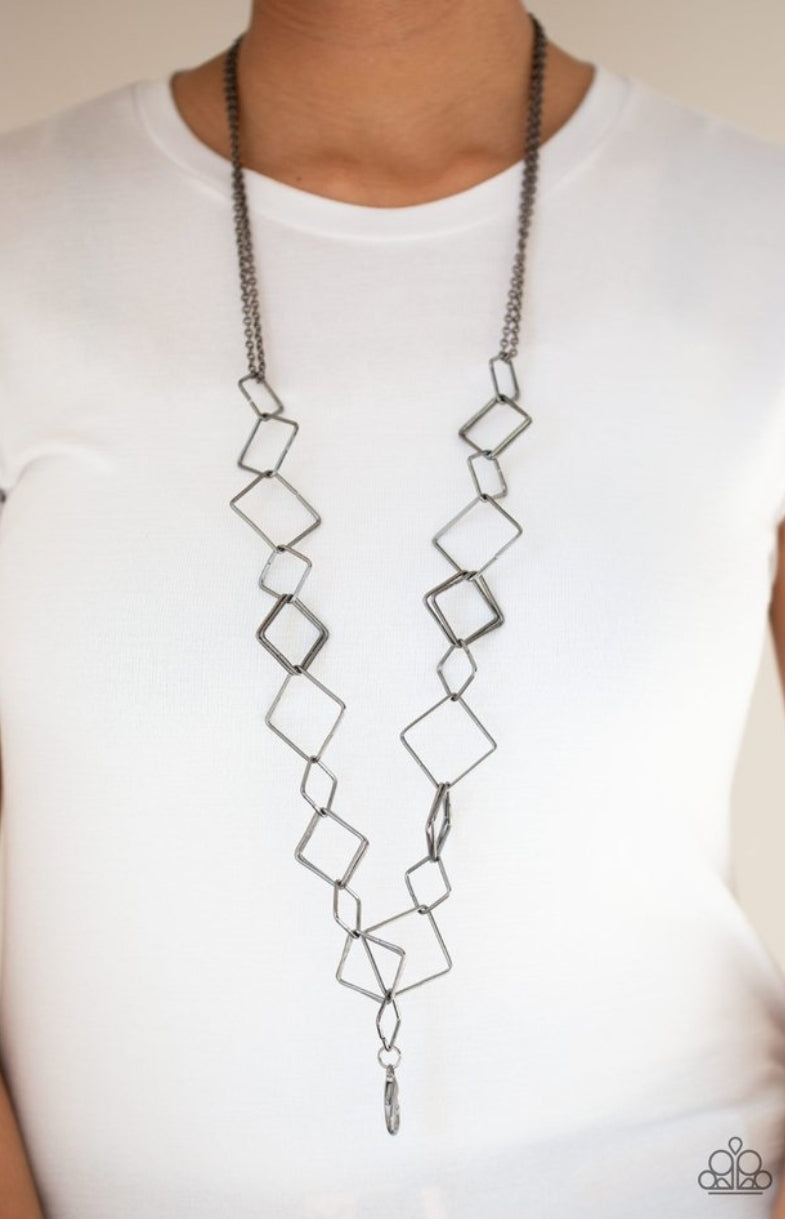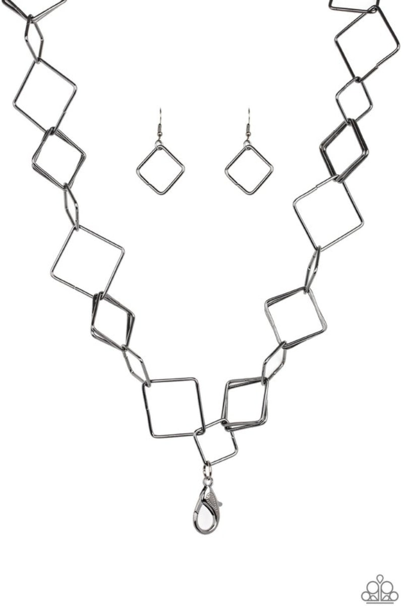 Varying in size, airy square silhouettes link across the chest for an edgy look. A lobster clasp hangs from the bottom of the design to allow a name badge or other item to be attached. Features an adjustable clasp closure.