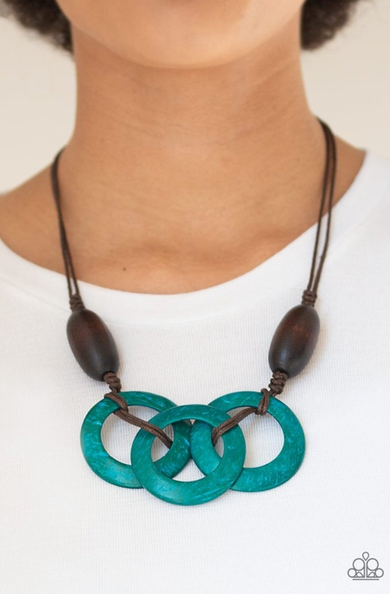 Infused with dramatic brown wooden beads, vivacious blue wooden hoops are knotted in place below the collar for a summery flair. Features an adjustable sliding knot closure.