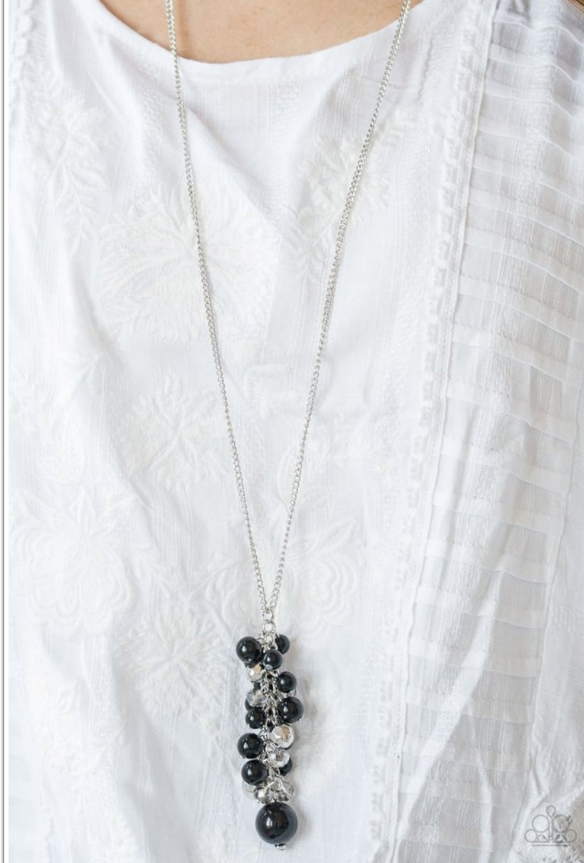 Mismatched black beads, white crystal-like beads, and faceted silver beads cascade from the bottom of an elongated silver chain, creating a refined clustered tassel. Features an adjustable clasp closure.