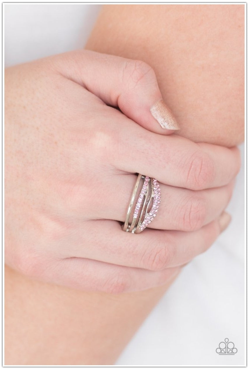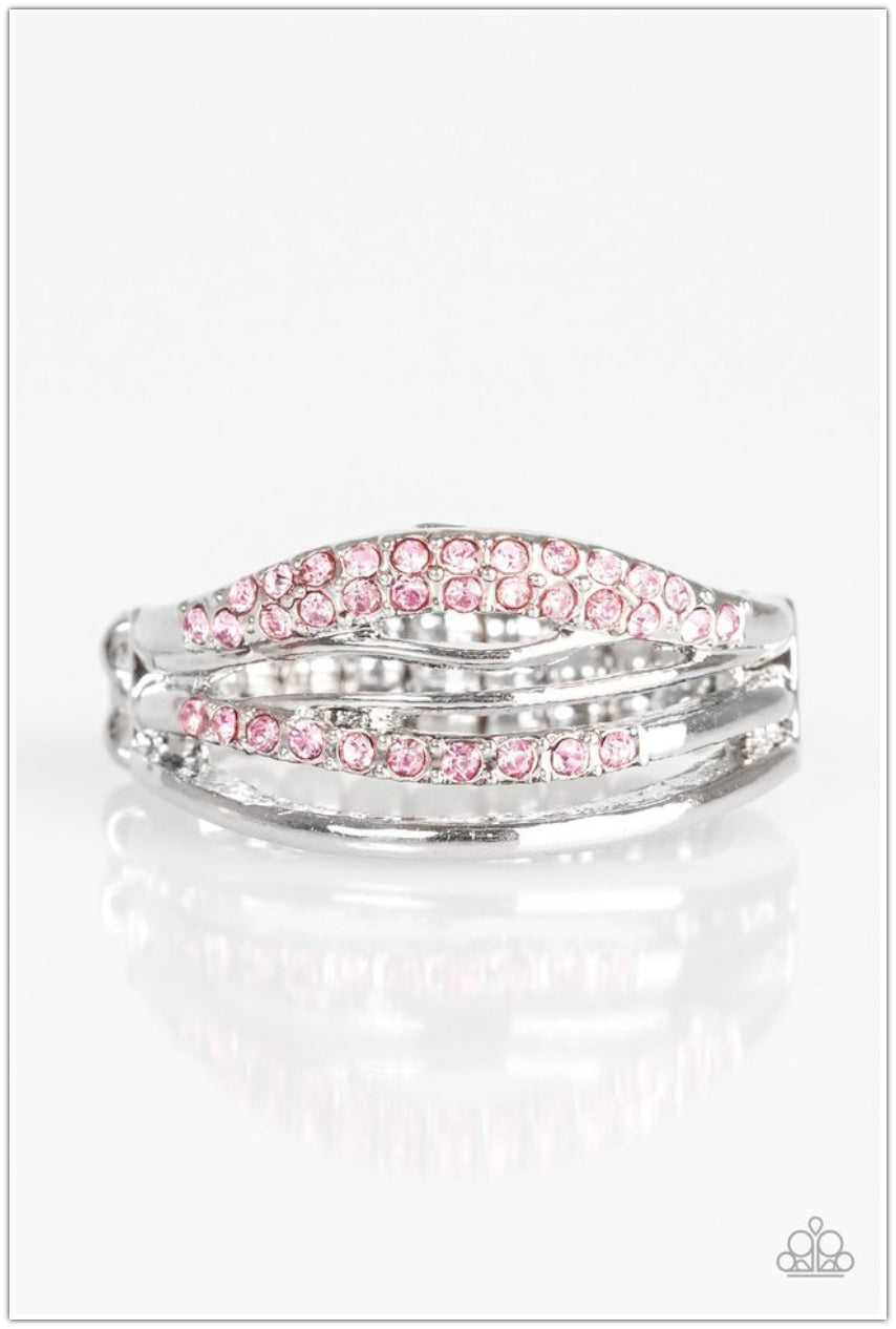 Varying in thickness, shimmery silver bars swoop across the finger. Two silver bands are encrusted in glittery pink rhinestones, adding a refined finish to the glamorous palette. Features a dainty stretchy band for a flexible fit.