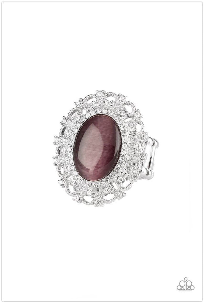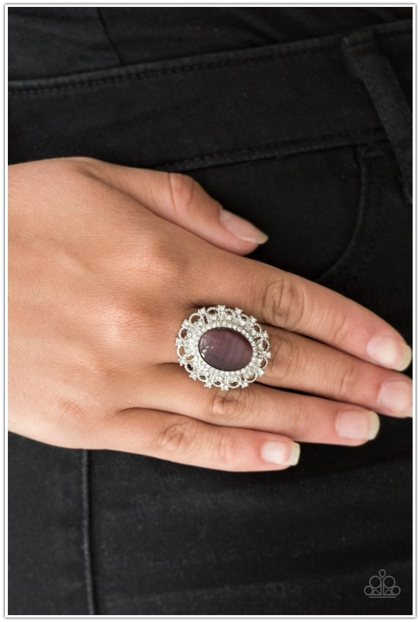 Encrusted in dainty white rhinestones, a frilly silver frame spins around a glowing purple moonstone center for a regal look. Features a stretchy band for a flexible fit.