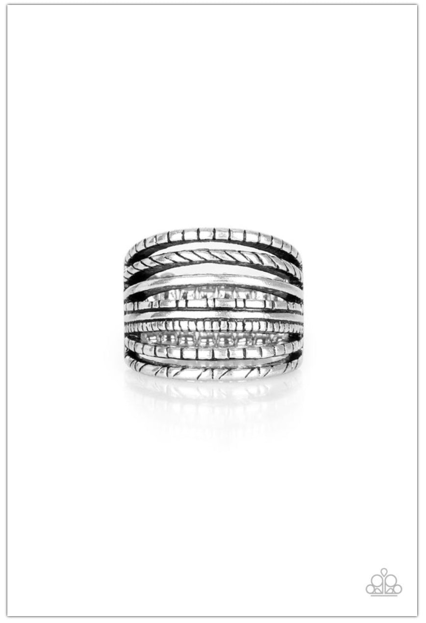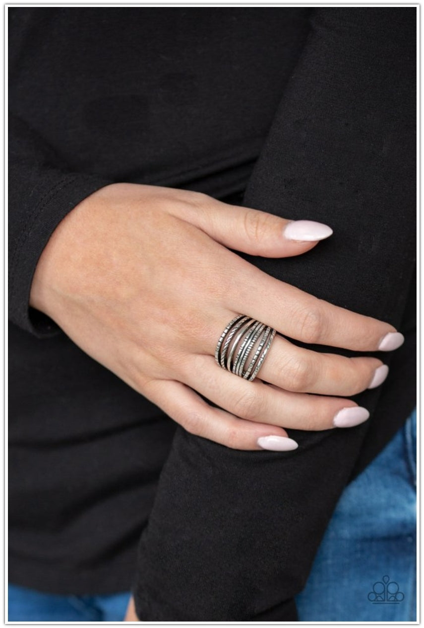 A collection of smooth and textured silver bars arc across the finger, stacking into a thick layered band. Features a stretchy band for a flexible fit.