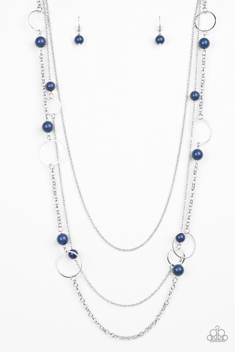 Featuring refreshing blue beads and shimmery silver hoops, mismatched silver chains layer down the chest for a seasonal look. Features an adjustable clasp closure.