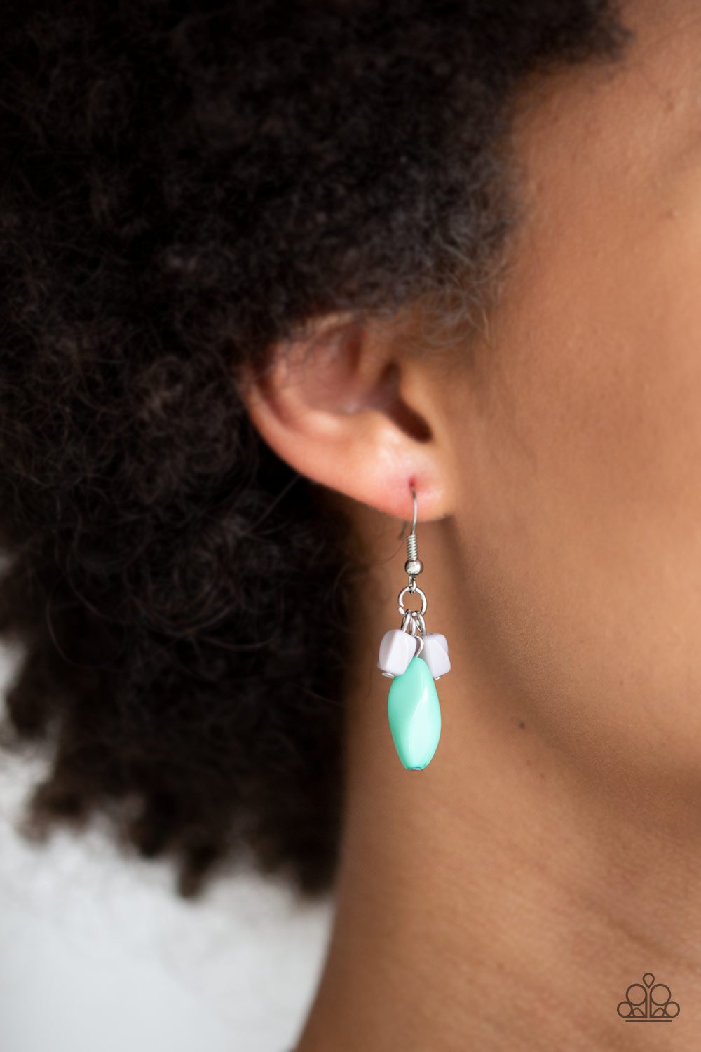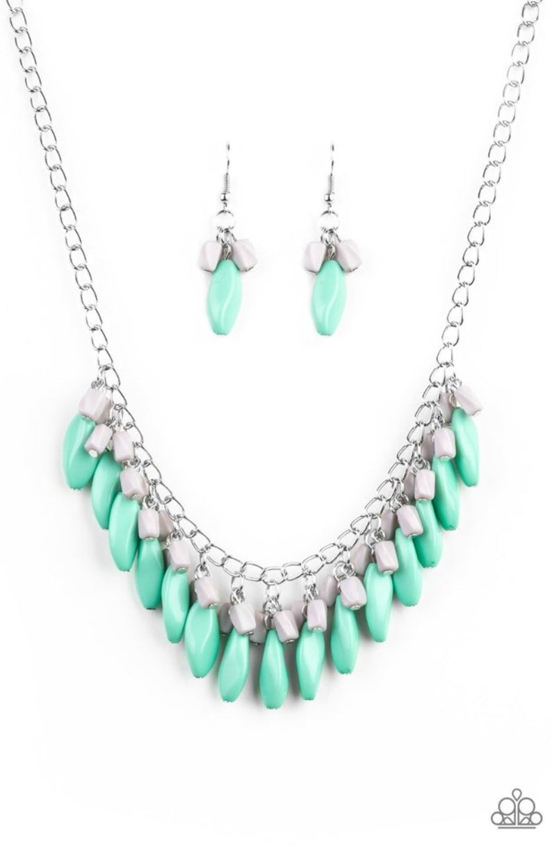 Varying in size and shape, imperfect green and gray beads cascade from the bottom of a shimmery silver chain, creating a vivacious fringe below the collar. Features an adjustable clasp closure.