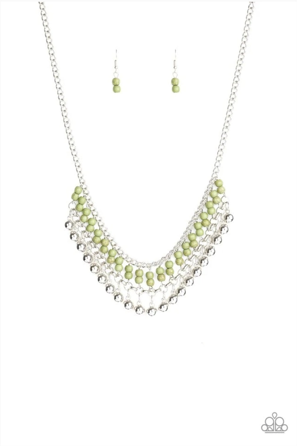 Threaded along dainty silver rods, stacks of green stone beads give way to a row of shiny silver beads, creating an earthy fringe below the collar. Features an adjustable clasp closure.