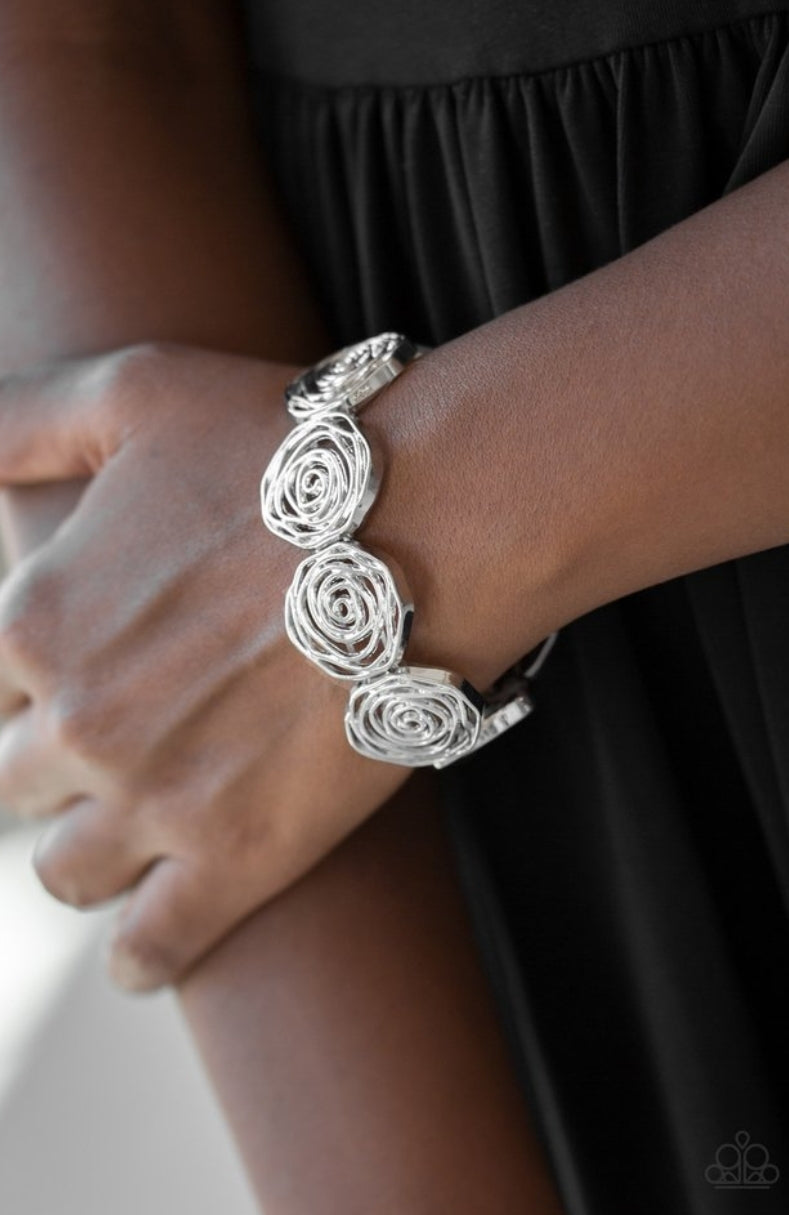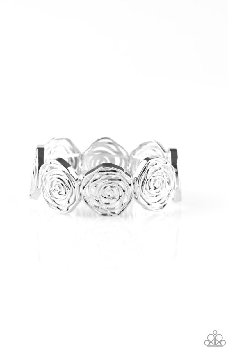 Brushed in a high-sheen shimmer, radiant silver bars spin into charming rosebud frames. The glistening rosebuds are threaded along a stretchy band, wrapping around the wrist for a whimsical look.