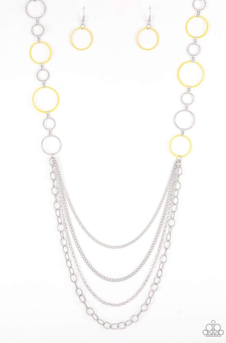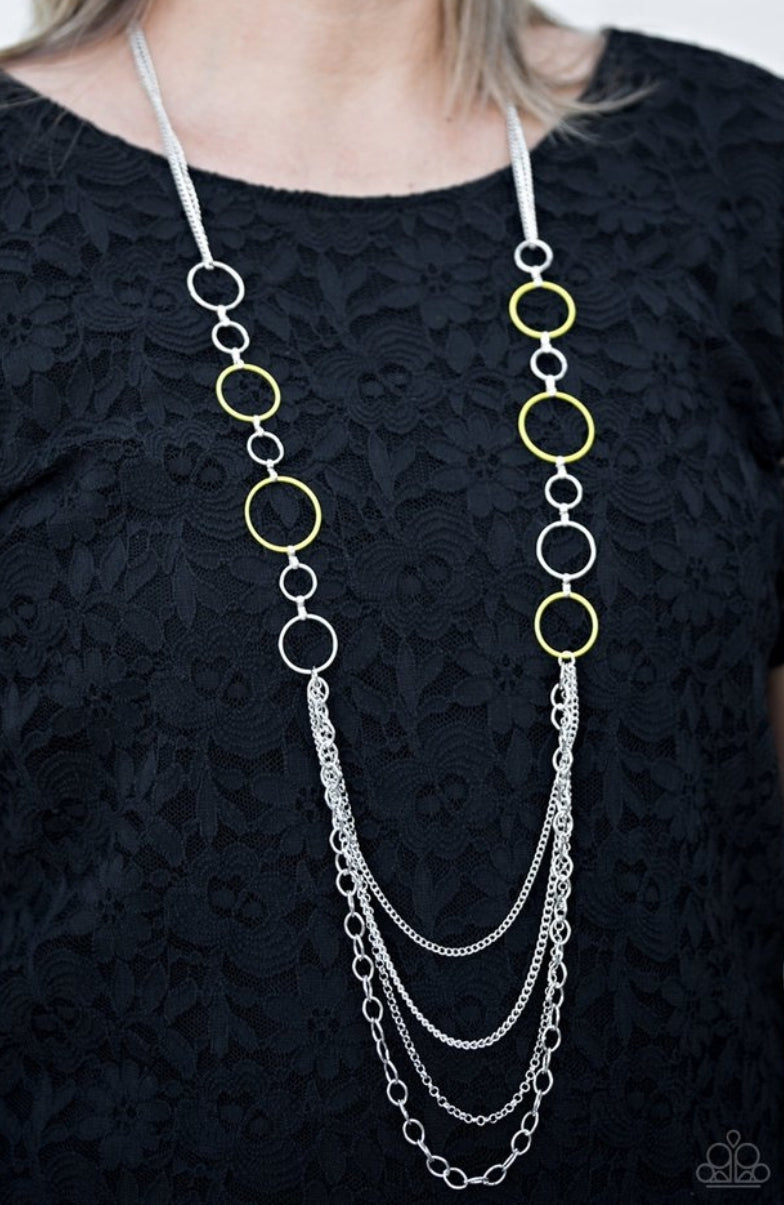 Sunny yellow and glistening silver hoops connect down the sides of the chest, giving way to a mismatched silver layers for an abstract finish. Features an adjustable clasp closure.