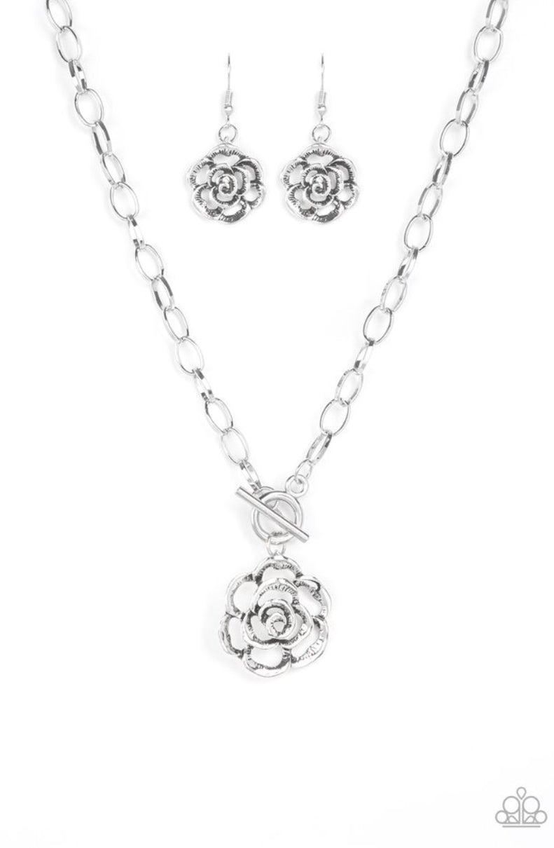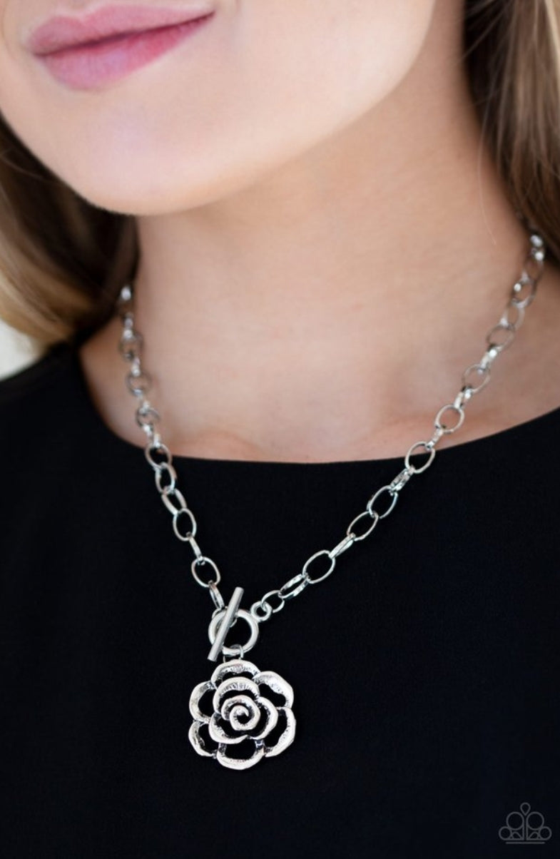 Brushed in an antiqued shimmer, an airy rosebud pendant swings from the bottom of a glistening silver chain below the collar for a vintage inspired look. Features a toggle closure.