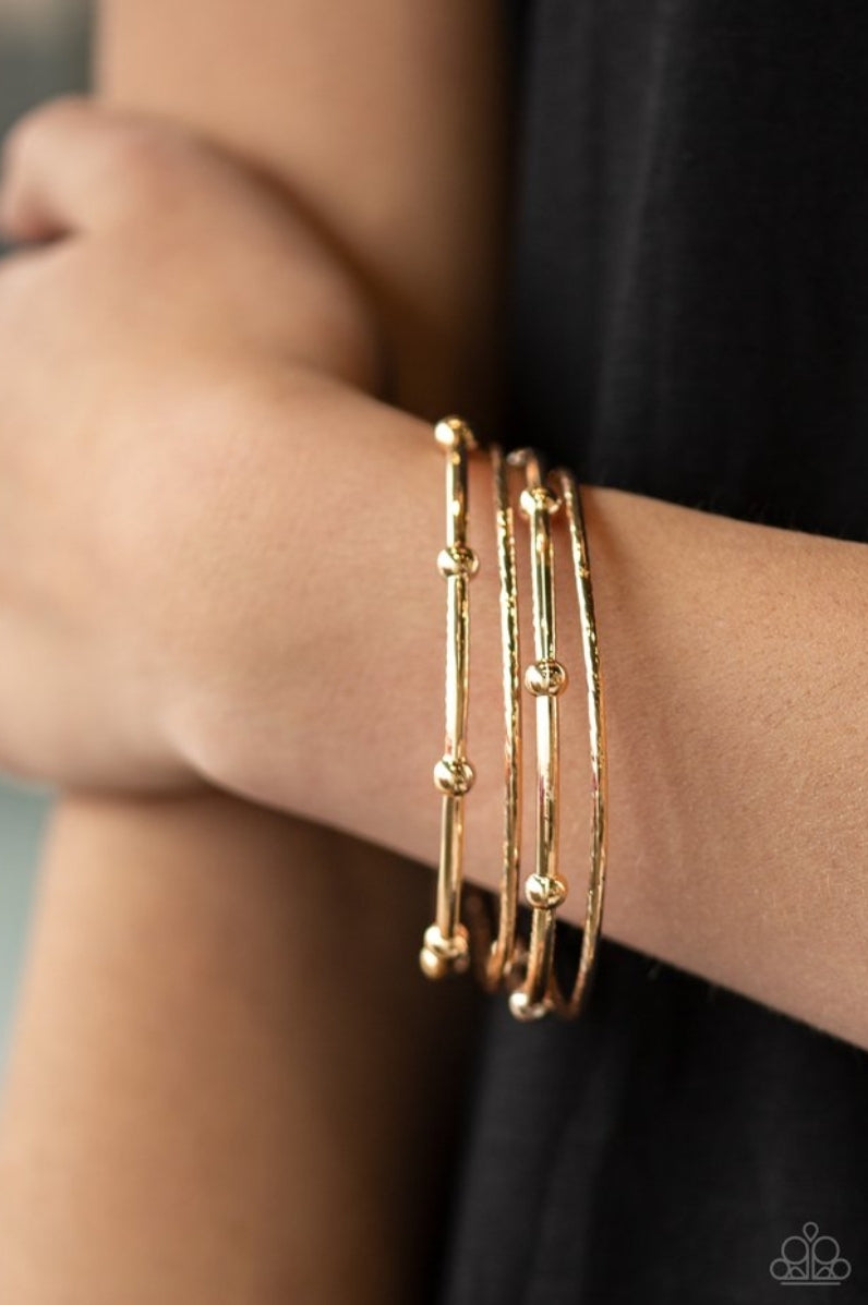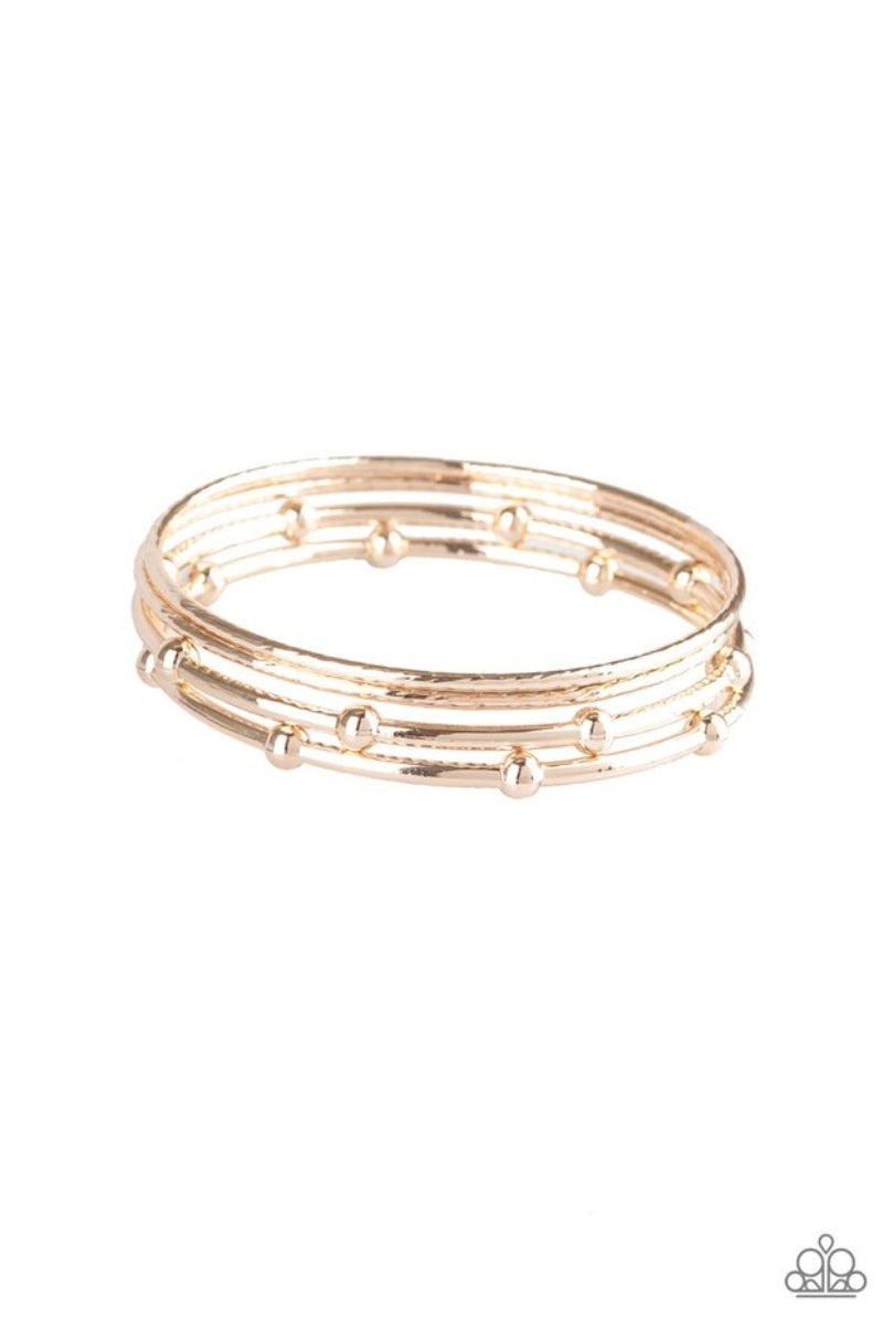 A pair of textured and beaded rose gold bangles slide up and down the wrist, creating endless shimmer.