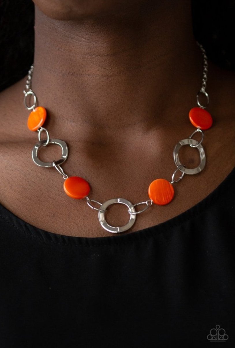 Orange shell-like discs link with asymmetrical silver hoops below the collar for a colorfully seasonal look. Features an adjustable clasp closure.