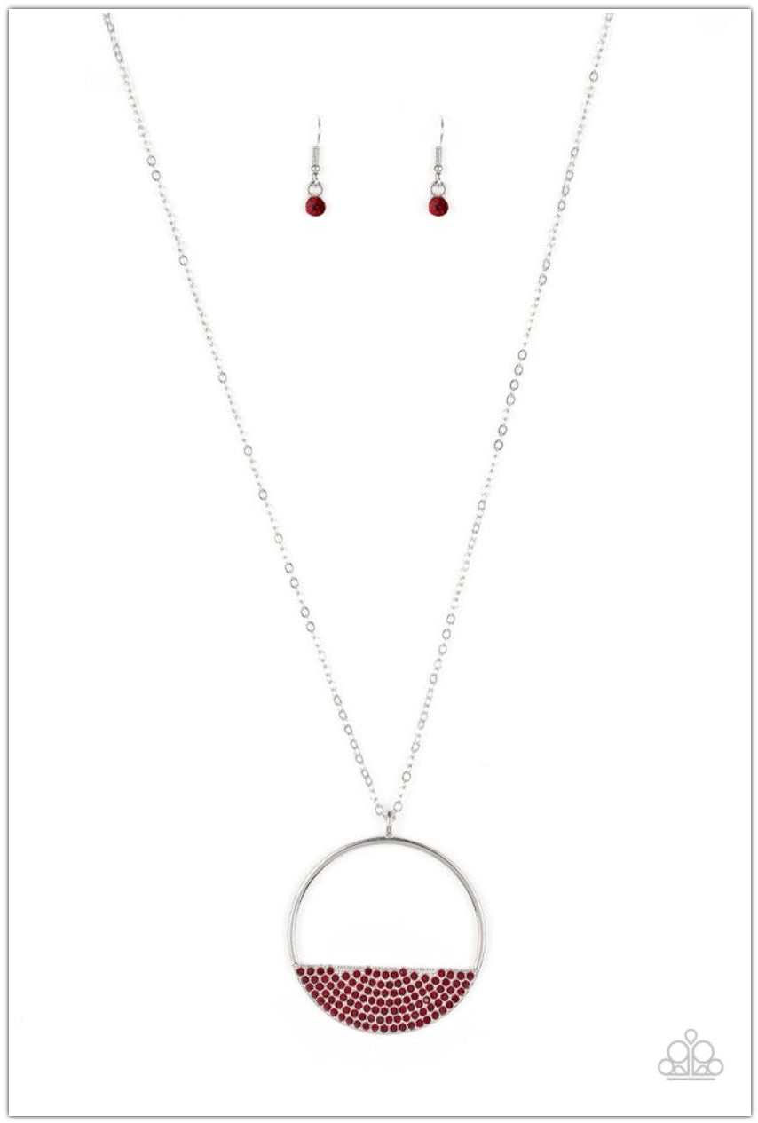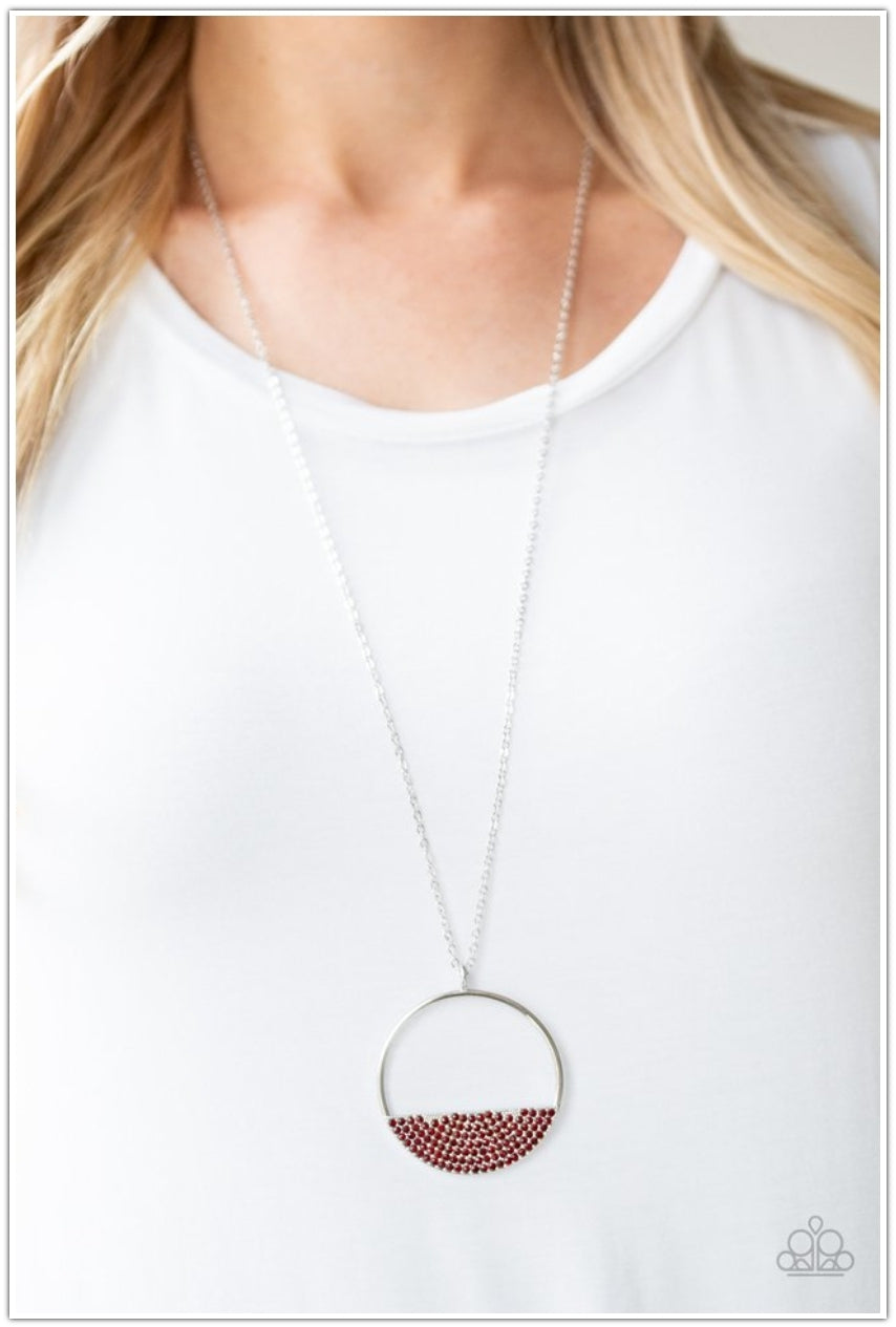 Encrusted in dainty red rhinestones, a silver crescent frame is pressed into the bottom of an airy circular pendant for a timeless look. Features an adjustable clasp closure.
