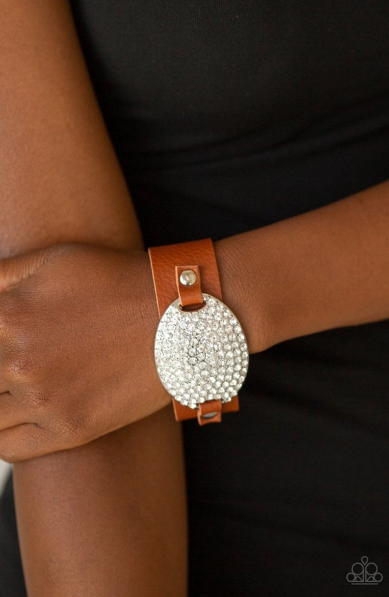 Countless white rhinestones are encrusted across the front of a dramatic silver frame that has been studded in place across the center of a brown leather band for a blinding look. Features an adjustable snap closure.