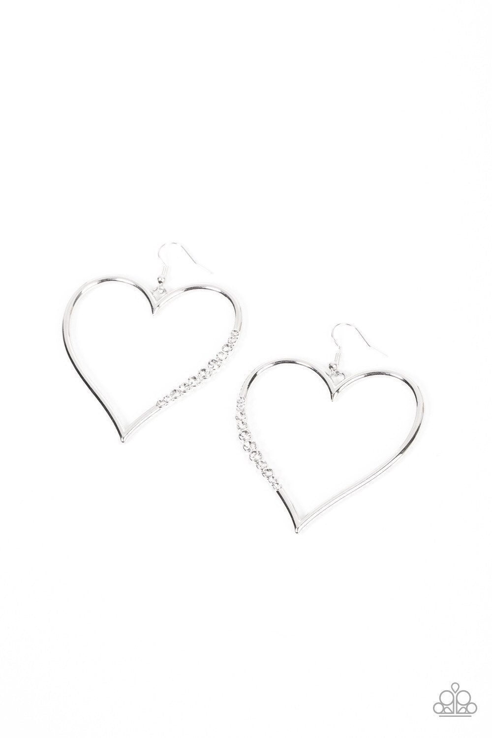 A section of glassy white rhinestones adorns a curvaceous silver heart frame, resulting in a heart-stopping sparkle. Earring attaches to a standard fishhook fitting.