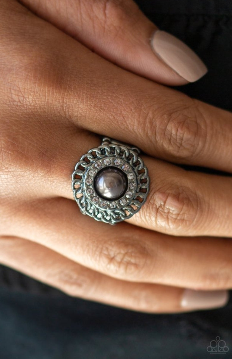 Shimmery gunmetal chain link spins around a ring of smoky rhinestones, creating an edgy frame. A pearly gunmetal bead is pressed into the center of the frame for a glamorous finish. Features a stretchy band for a flexible fit.