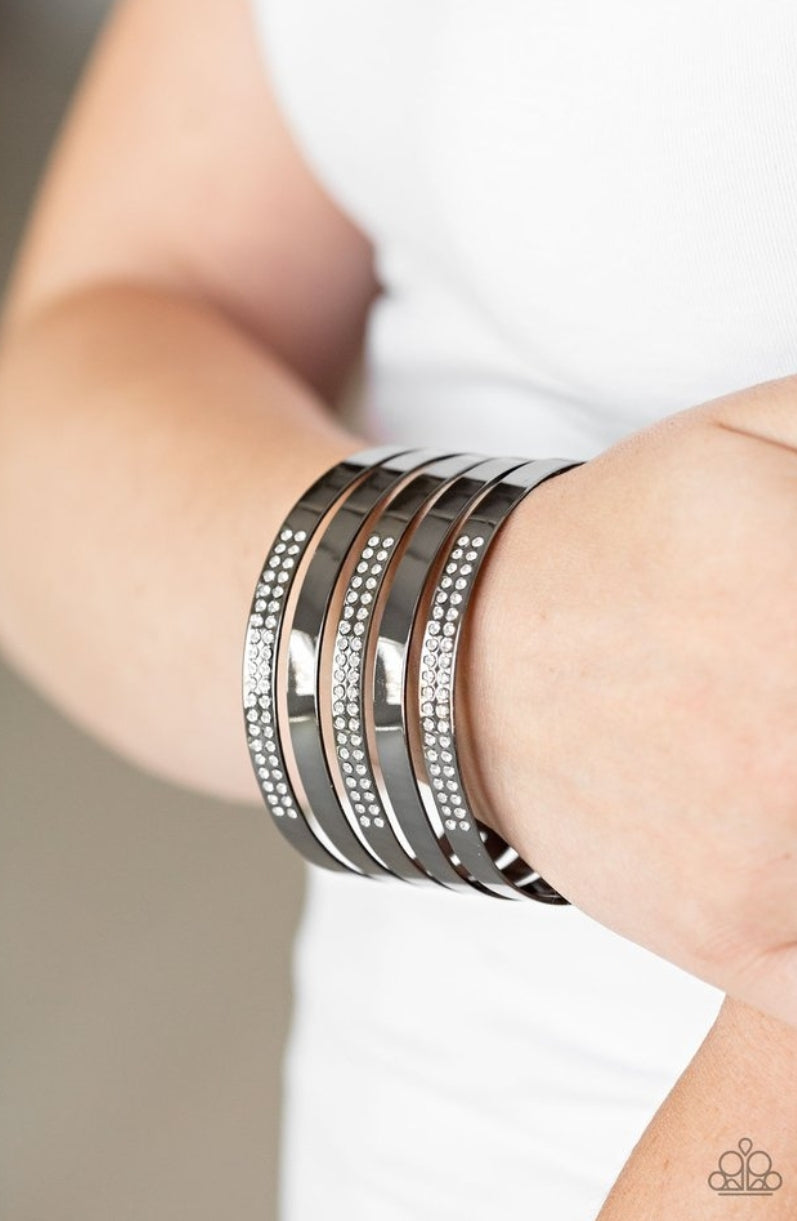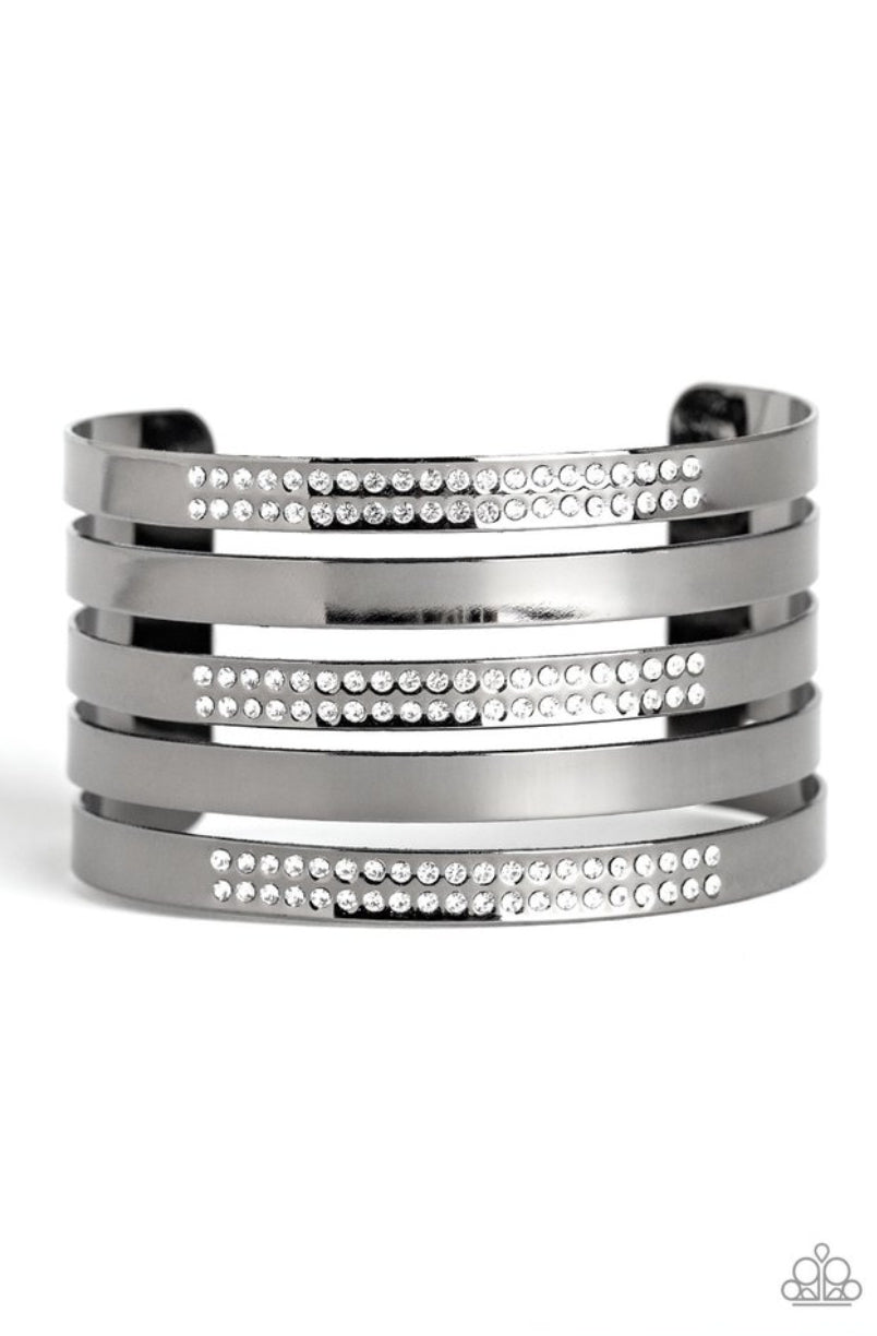 Smooth gunmetal and glittery white rhinestone encrusted gunmetal bands alternate across the wrist, stacking into a statement-making cuff.