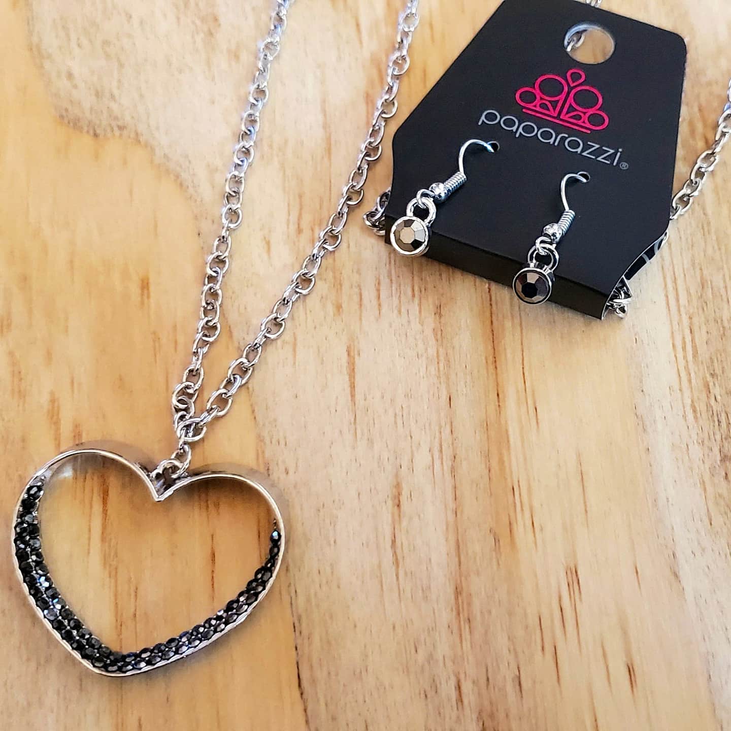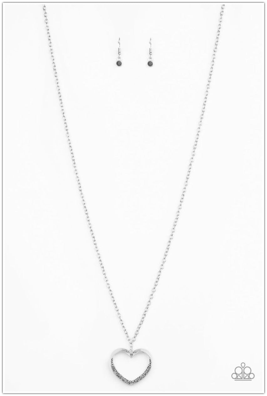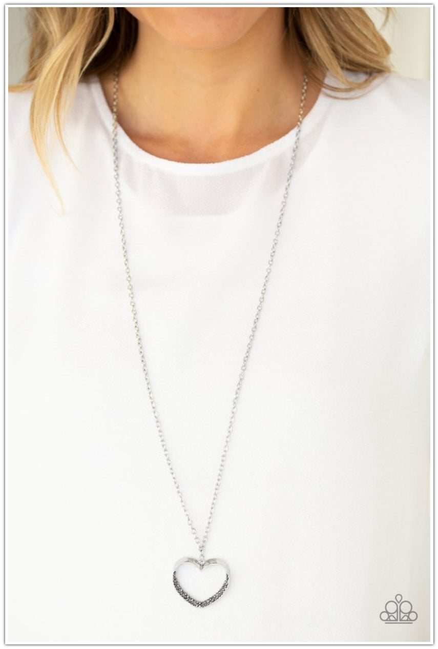 The bottom of a beveled silver heart frame is encrusted in two rows of glittery hematite rhinestones, creating a charming pendant at the bottom of a lengthened silver chain. Features an adjustable clasp closure.