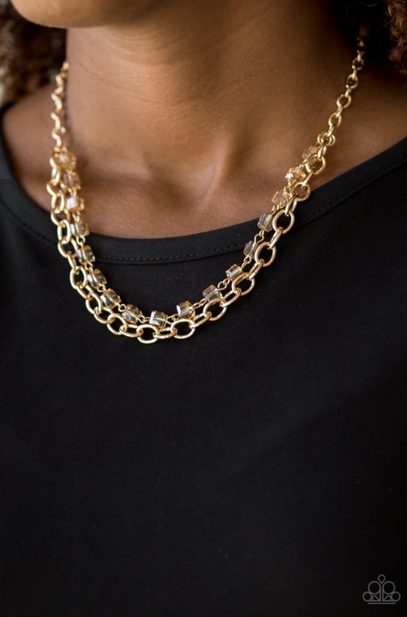 NECKLACE: A strand of golden crystal-like cube beading joins a classic strand of gold chain below the collar, creating refined layers. Features an adjustable clasp closure.