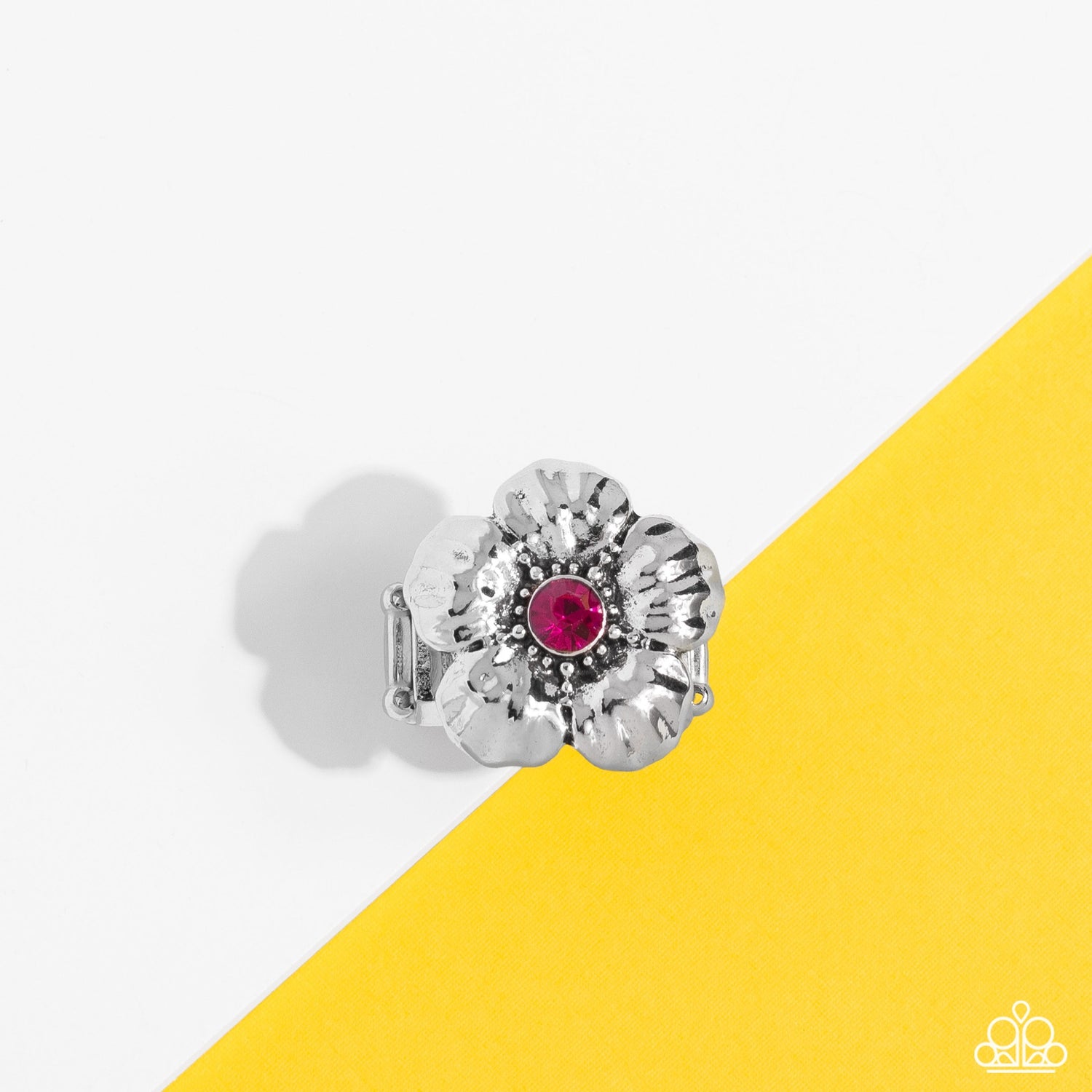 Dotted with dainty silver studs and a dainty fuchsia rhinestone center, folds of shiny silver curl into an oversized tropical flower for a whimsical dash of island inspiration atop the finger. Features a stretchy band for a flexible fit.
