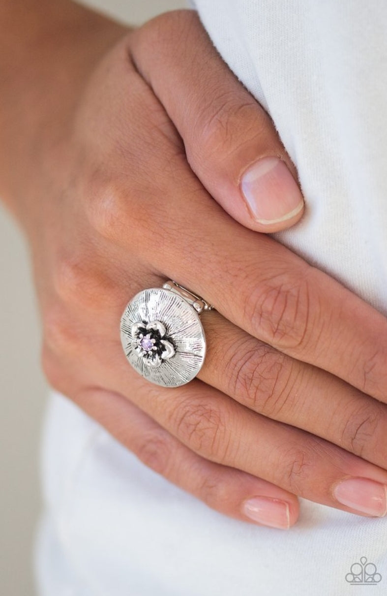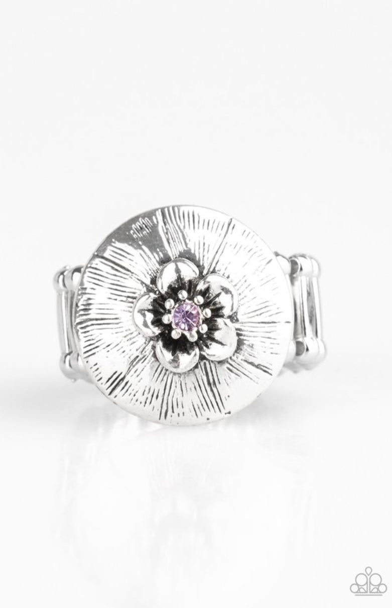 Dotted with a sparkling purple rhinestone, a dainty silver flower blooms atop a rounded frame radiating with shimmery silver texture for a seasonal look. Features a stretchy band for a flexible fit.