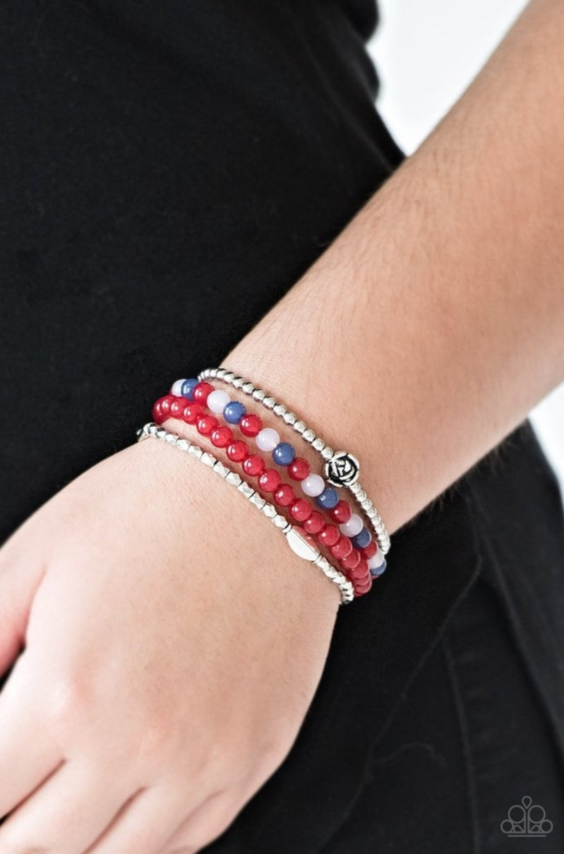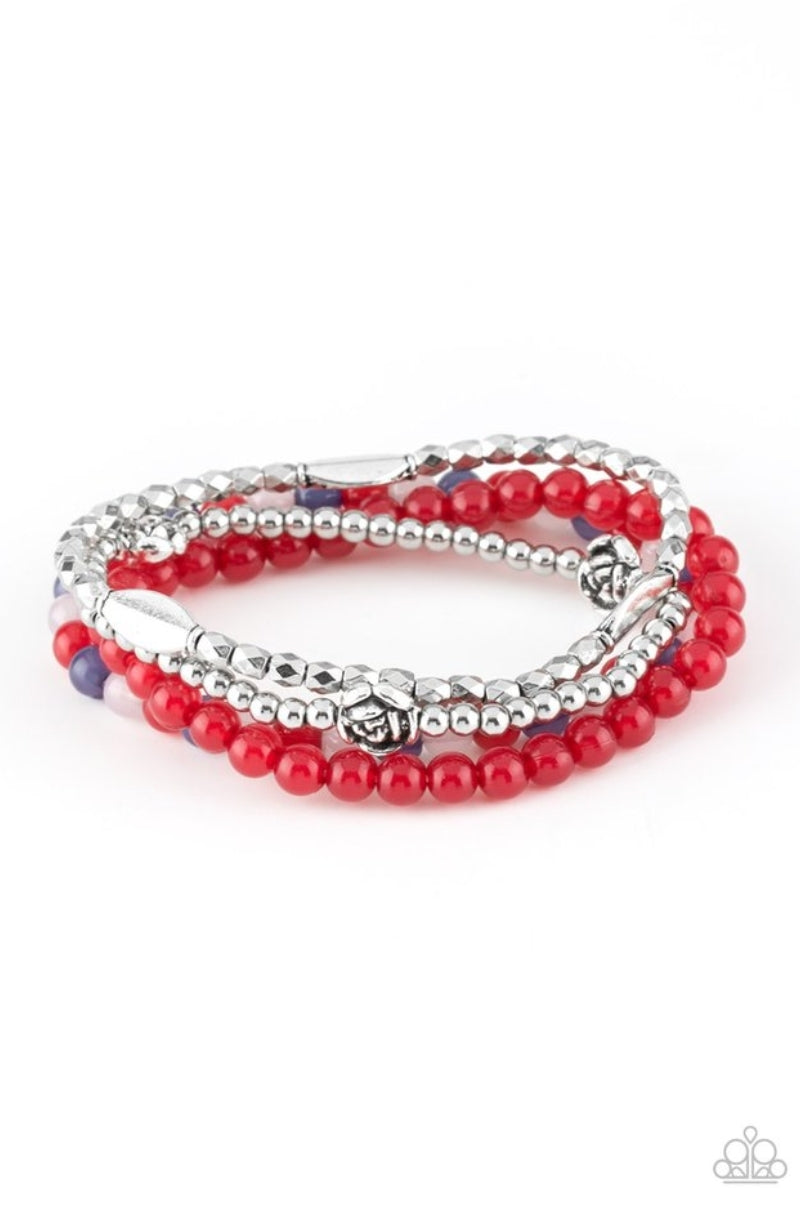 Mismatched silver beads and strands of glassy blue, red, and white beads are threaded along stretchy bands. Infused with silver accents, dainty rose blossoms adorn the wrist for a seasonal finish.