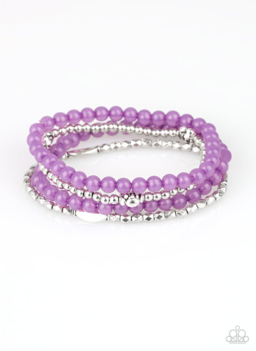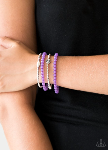 Mismatched silver beads and strands of glassy purple beads are threaded along stretchy bands. Infused with silver accents, dainty rose blossoms adorn the wrist for a seasonal finish.