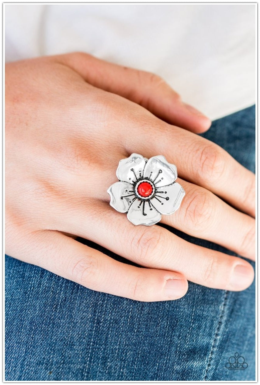 A bright red bead is pressed into the center of a blooming silver flower radiating with antiqued details for a whimsical look. Features a stretchy band for a flexible fit.