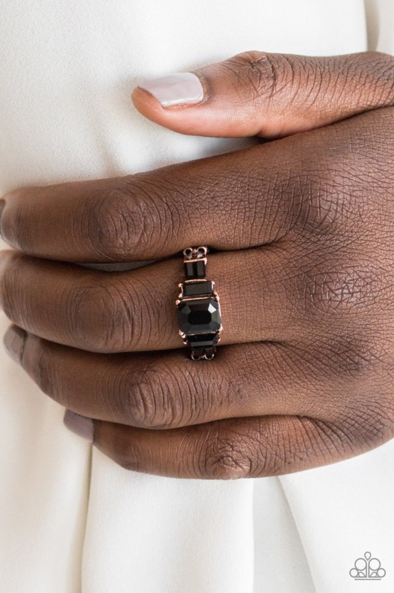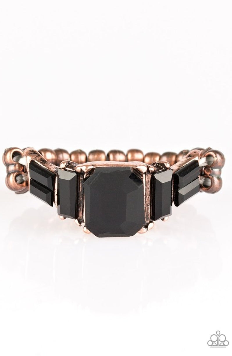 Varying in cut and shimmer, glittery black rhinestones stack into a glamorous band across the finger. Features a dainty stretchy band for a flexible fit.